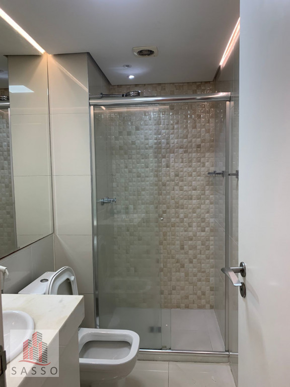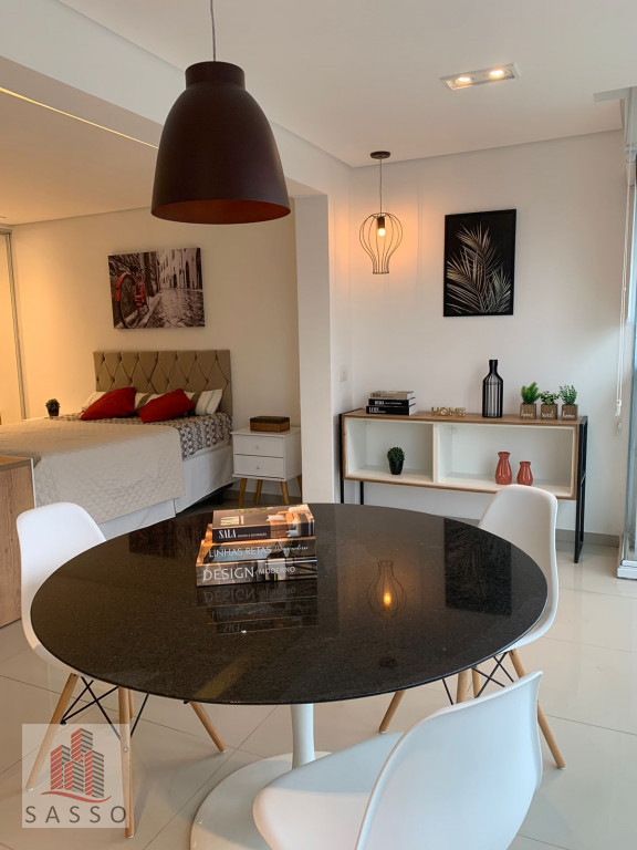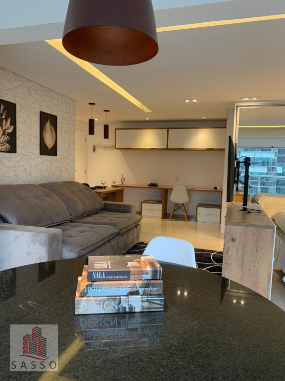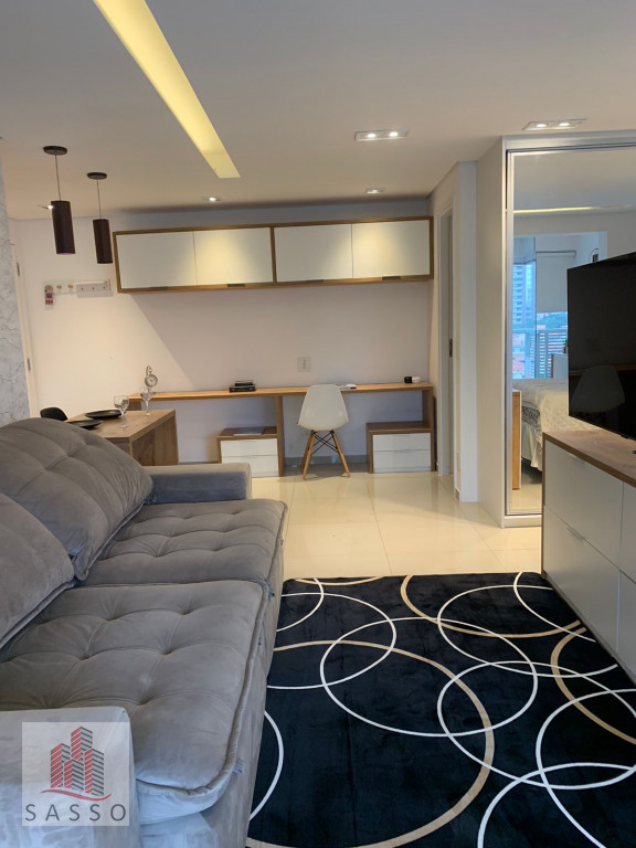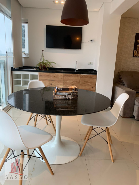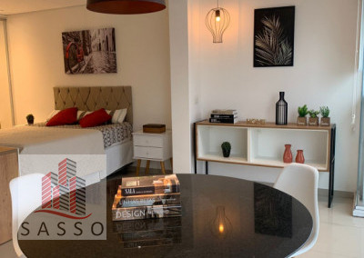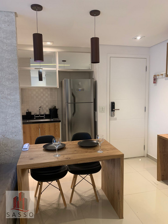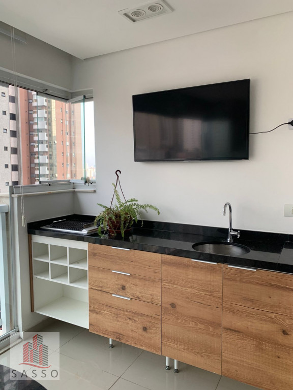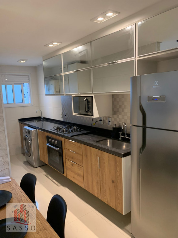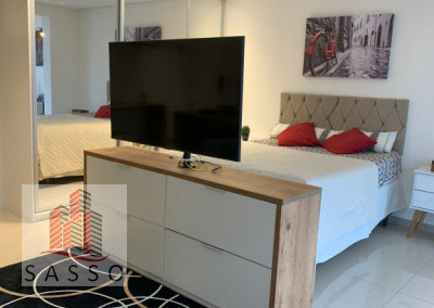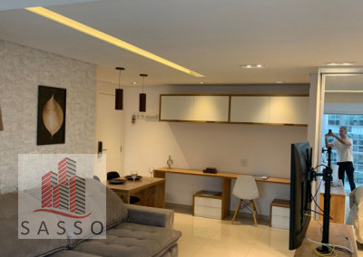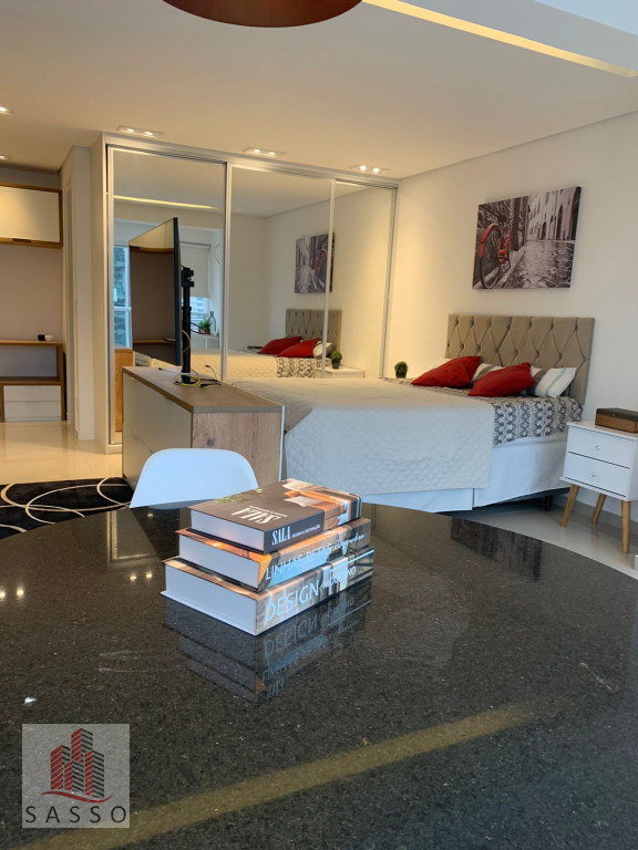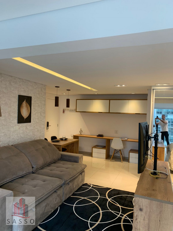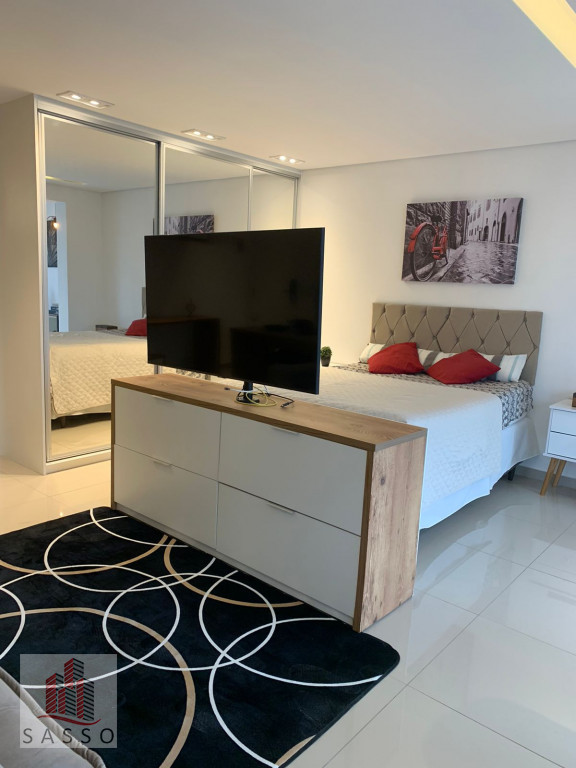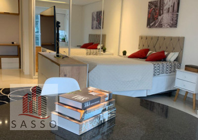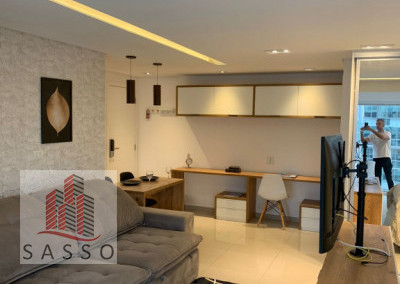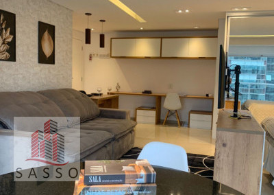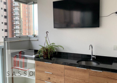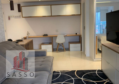 Apartamento mobiliado, com sacada fechada com vidro, cozinha com armários, fogão cooktop, micro-ondas, forno, box, geladeira, 2 Tvs, sofá quadros, mesa de jantar, escritório, espelhos, armários no dormitório, na saca e na lavanderia, banheiro com box de vidro e pia com gabinete, cama no quarto e luminárias.