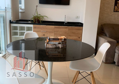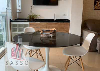 São 52 metros quadrados com 1 dormitório, sala e sacada, cozinha, área de serviço e 1 vaga de garagem.