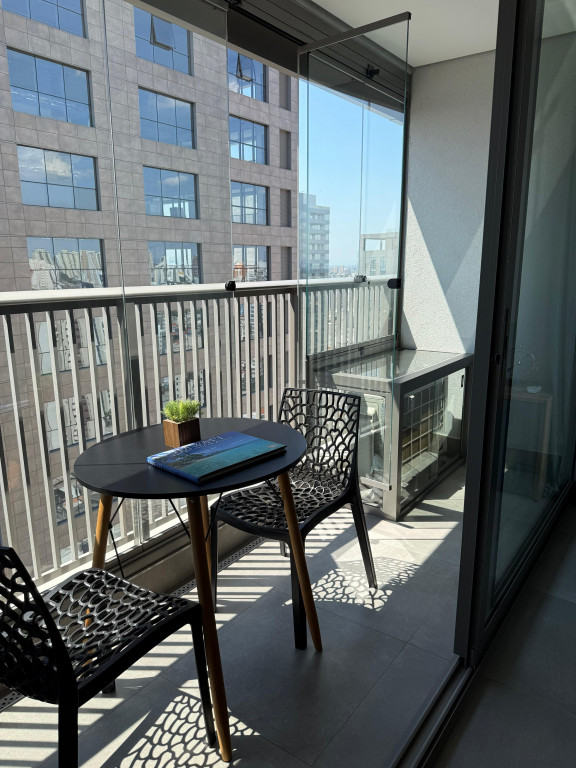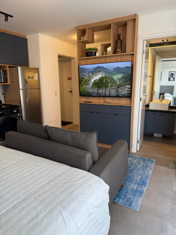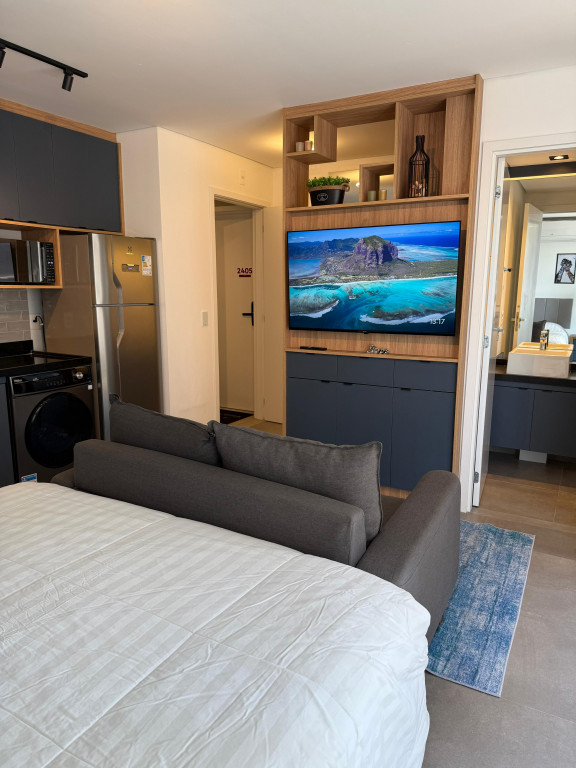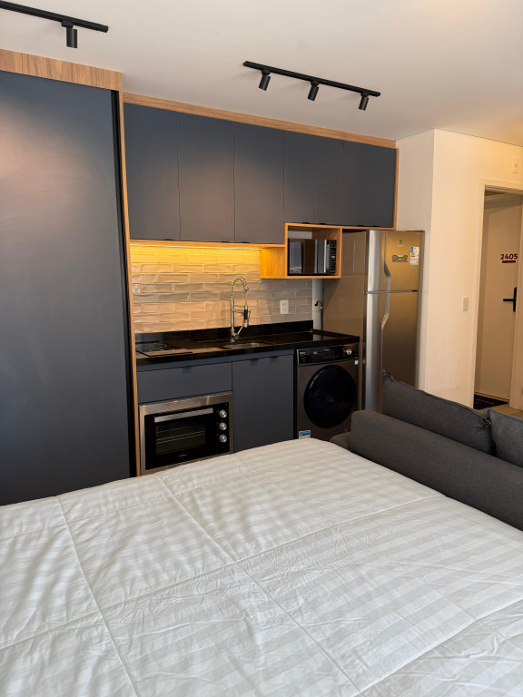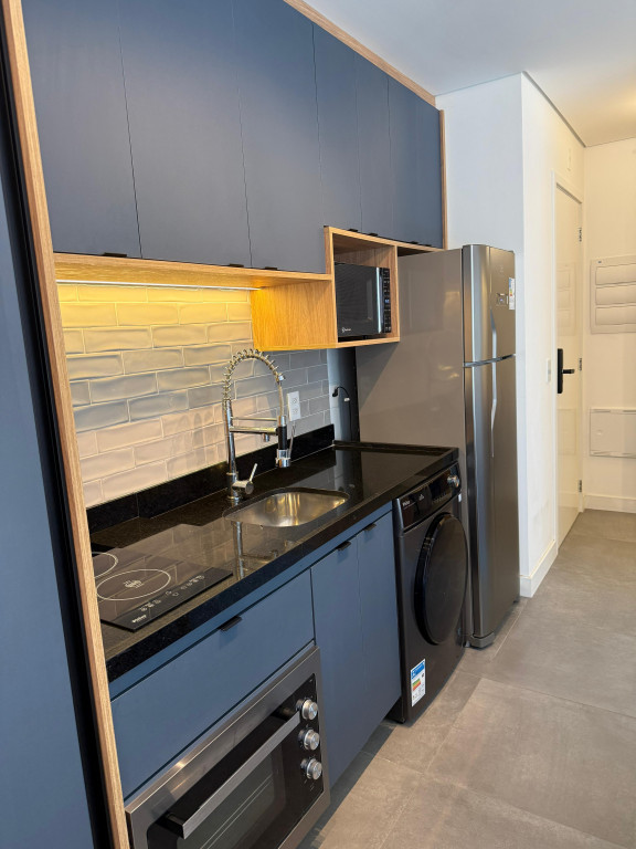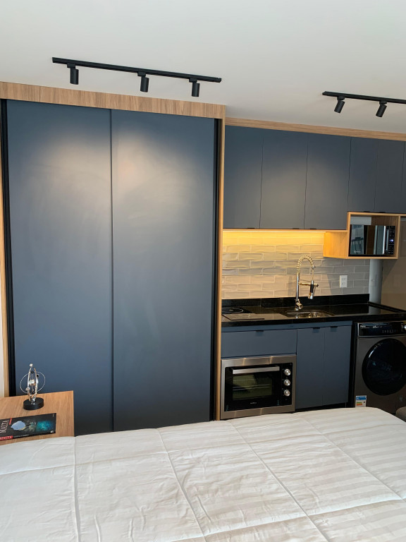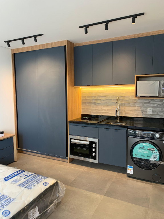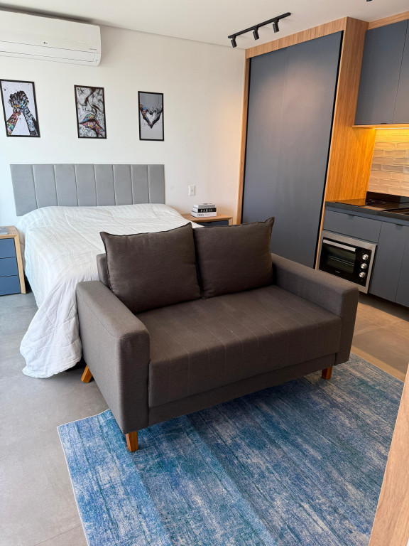 Apartamento Studio totalmente mobiliado, com ar-condicionado, Tv 50 polegadas, box+ colchão, geladeira, micro-ondas, forno, máquina de lavar e secar, cooktop, mesa e cadeiras, iluminação completa com led, espelhos, gabinete no banheiro, armários e escritório, fechamento de sacada, sofá, tapete e objetos de decoração. Portaria 24 hrs, academia, piscina e salão de festas.