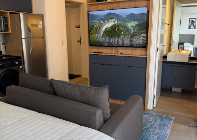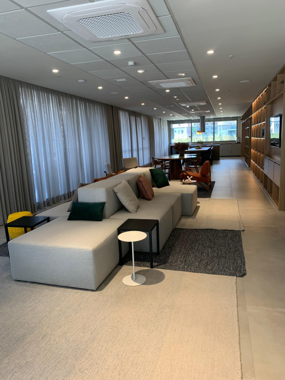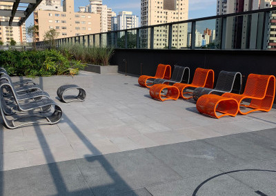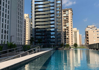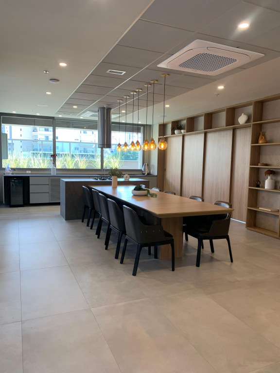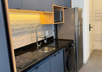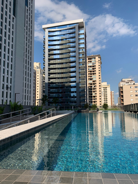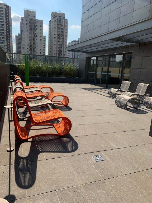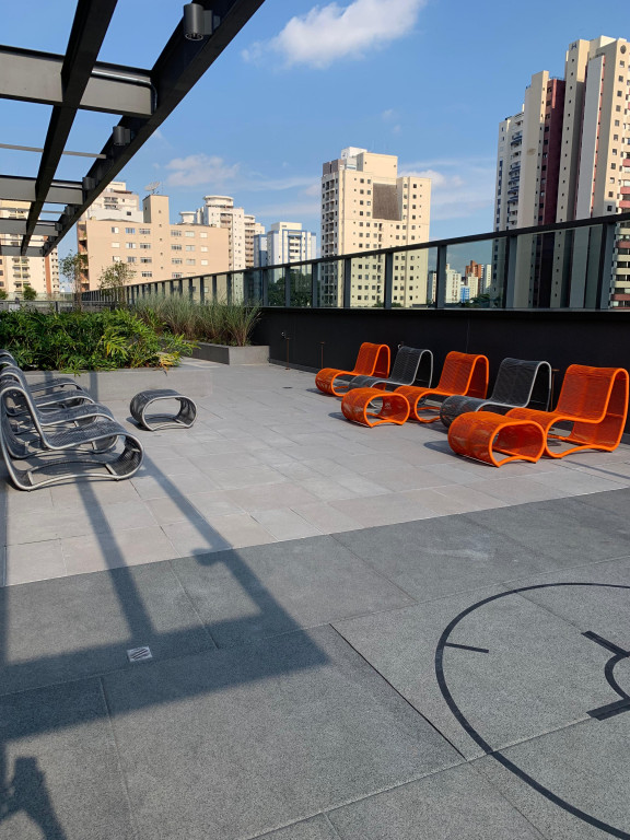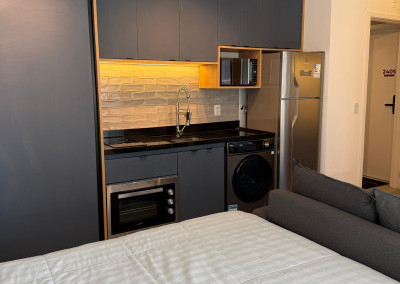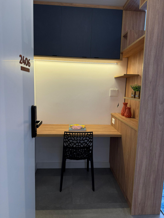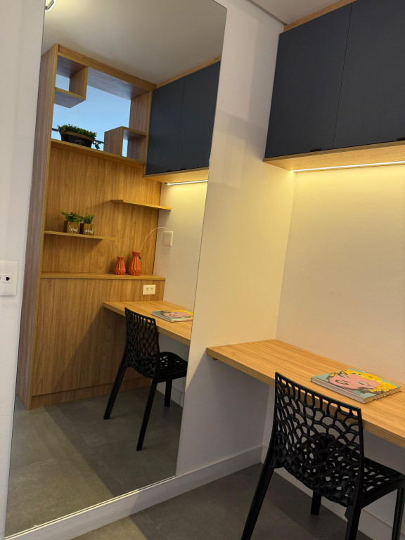 Apartamento Studio totalmente mobiliado, com ar-condicionado, Tv 50 polegadas, box+ colchão, geladeira, micro-ondas, forno, máquina de lavar e secar, cooktop, mesa e cadeiras, iluminação completa com led, espelhos, gabinete no banheiro, armários e escritório, fechamento de sacada, sofá, tapete e objetos de decoração. Portaria 24 hrs, academia, piscina e salão de festas.