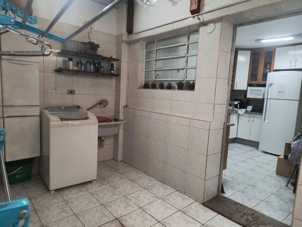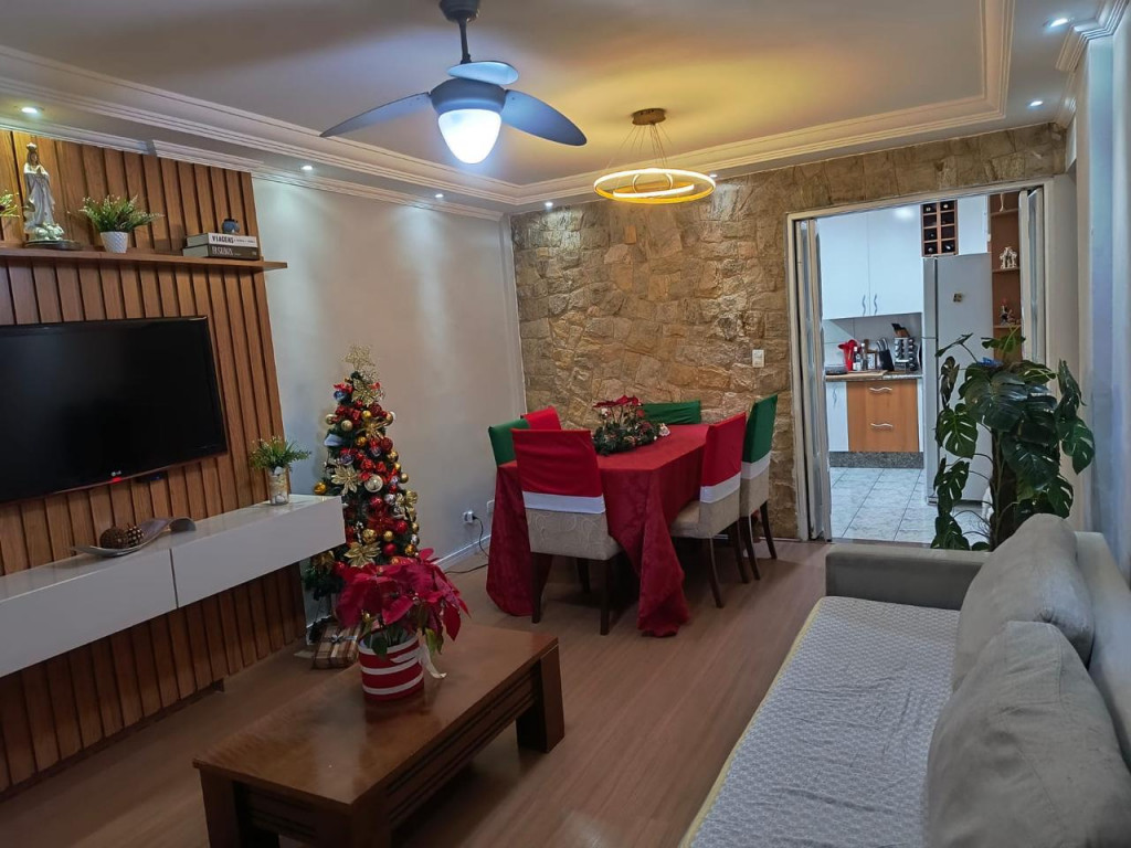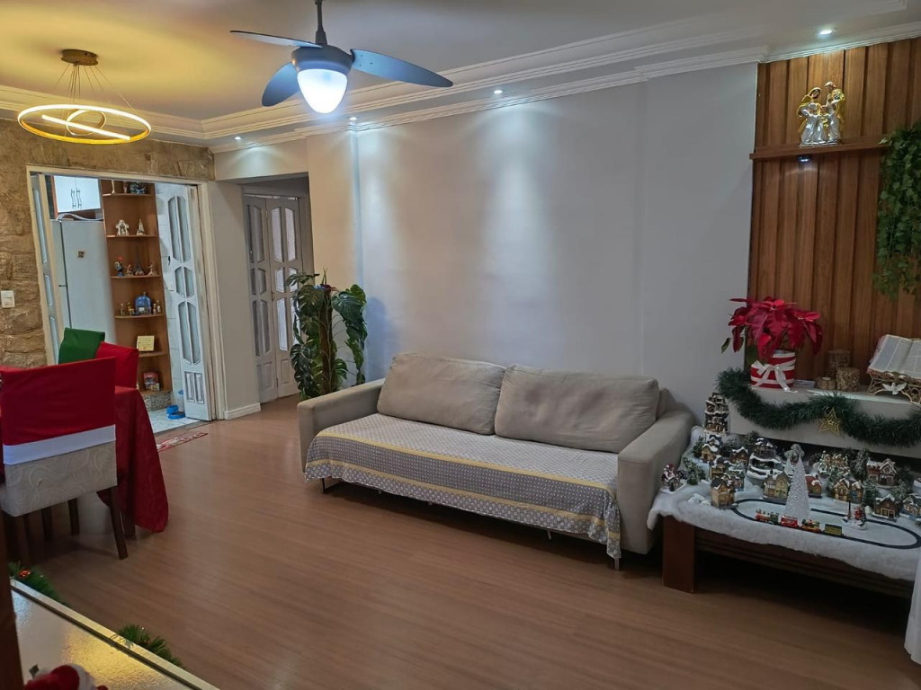 São 86 metros quadrados com 2 quartos, sala para 2 ambientes, cozinha, área de serviço, banheiro e 1 vaga de garagem.