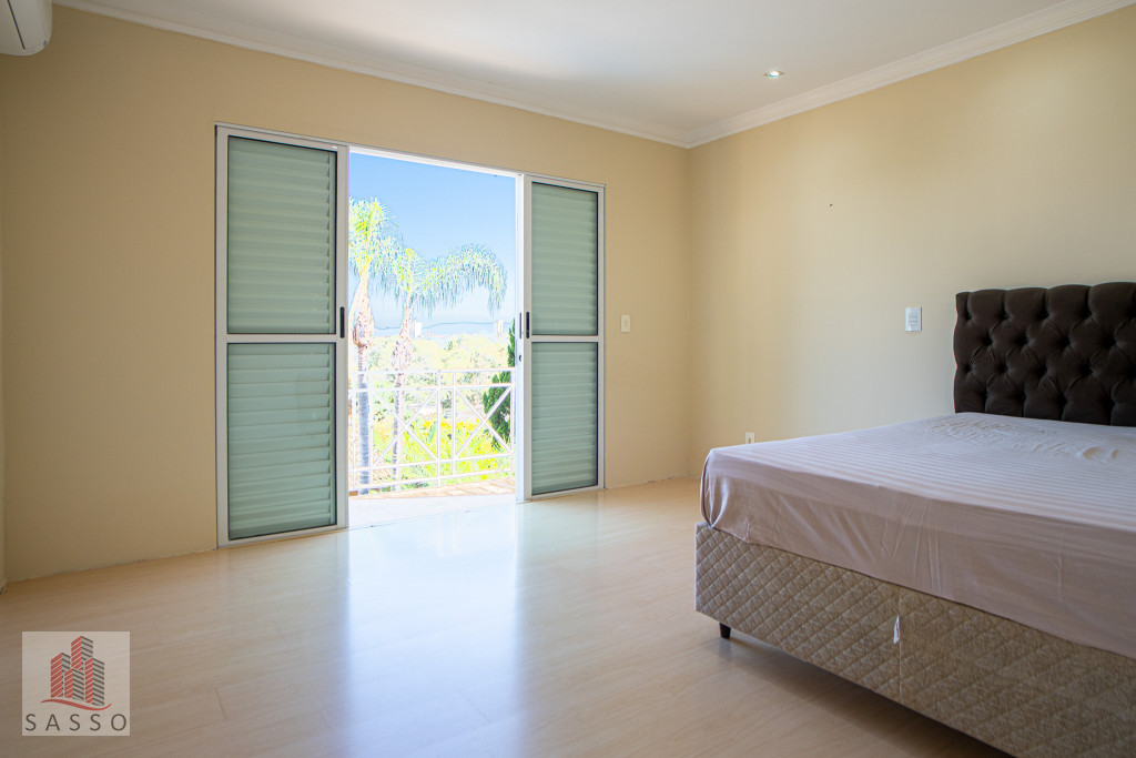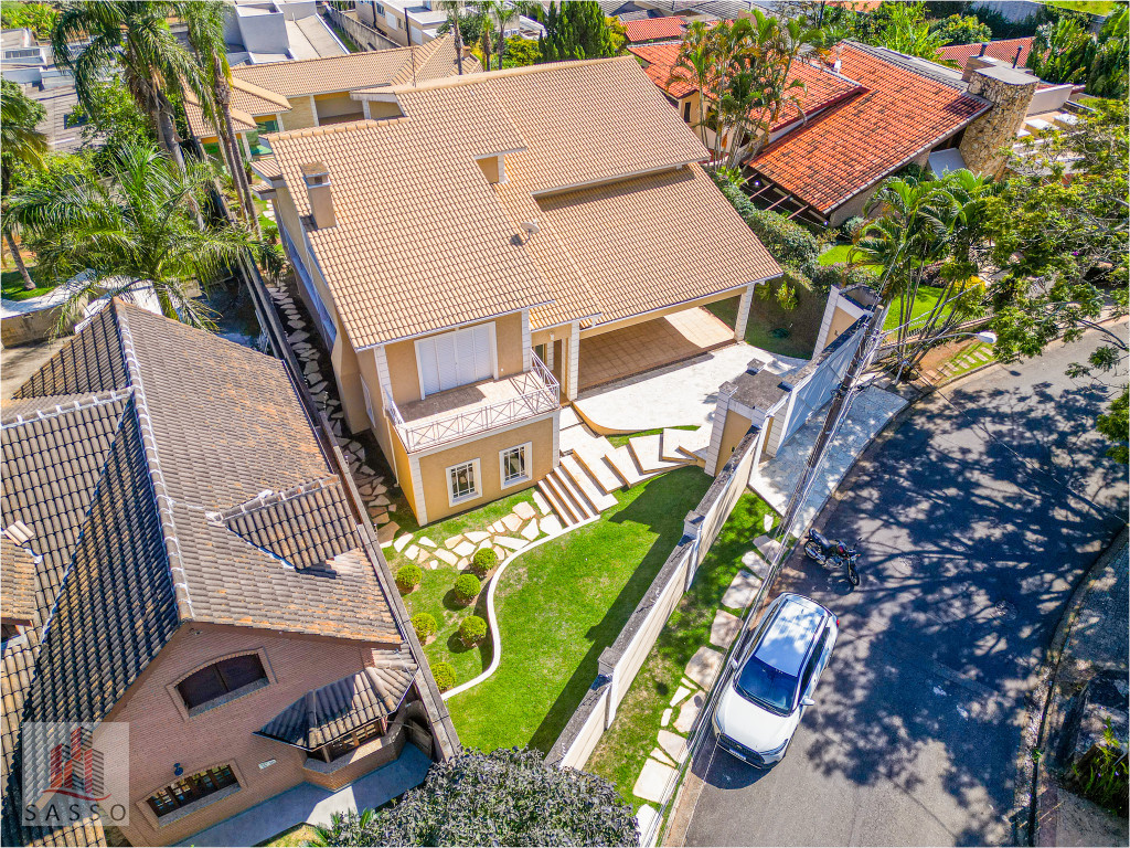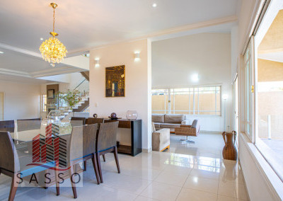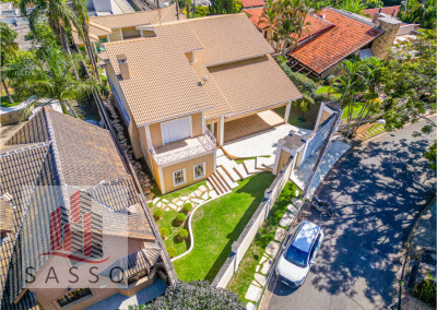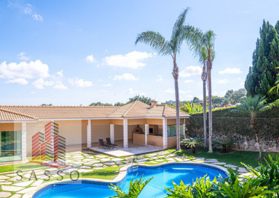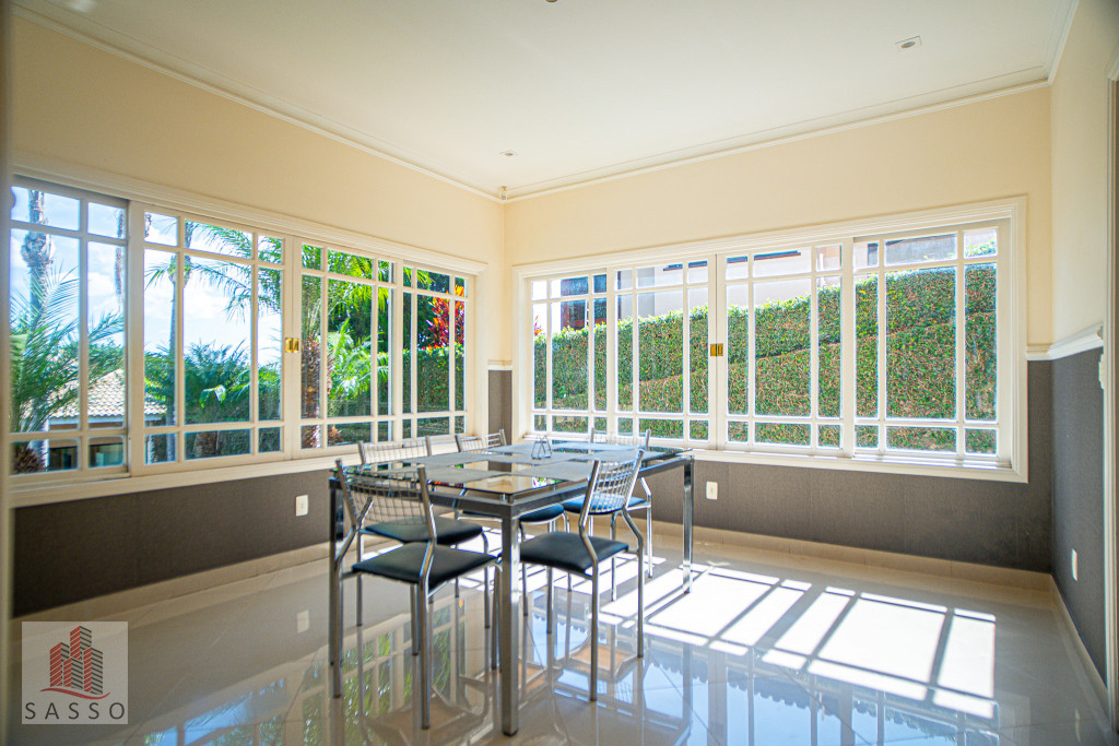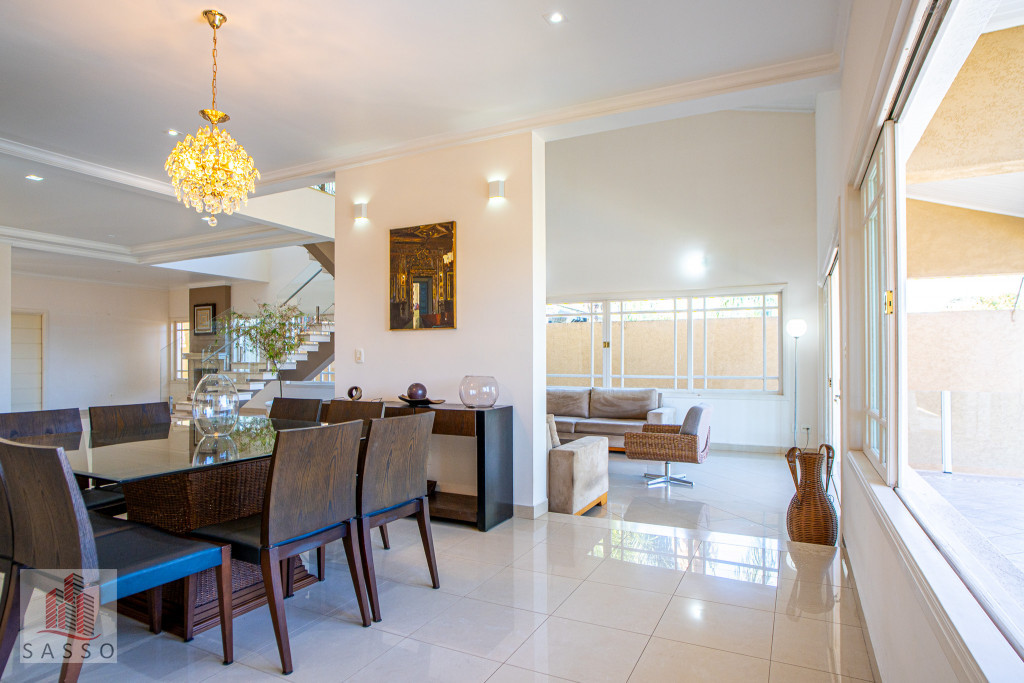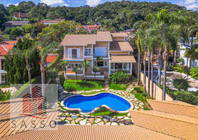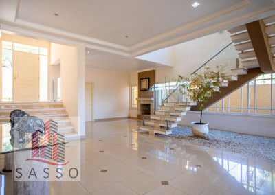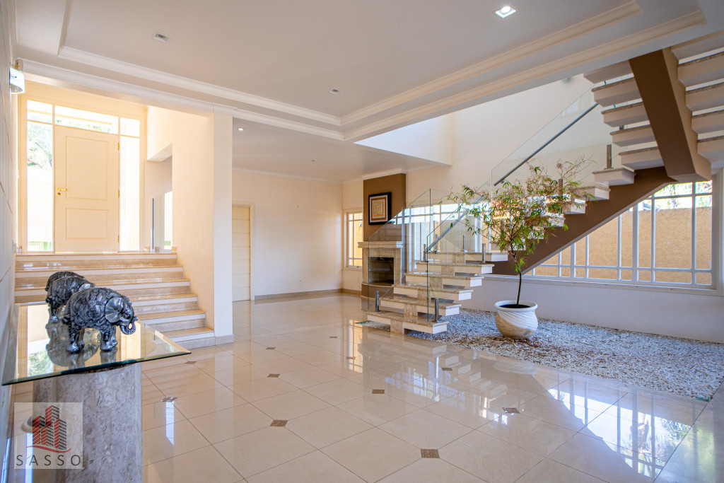 São 620 metros quadrados com 4 quartos suítes, sala de estar, varanda, cozinha, 6 banheiros, sala de lareira e 7 vagas de garagem