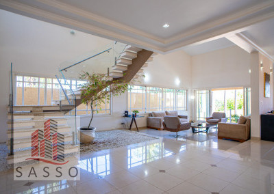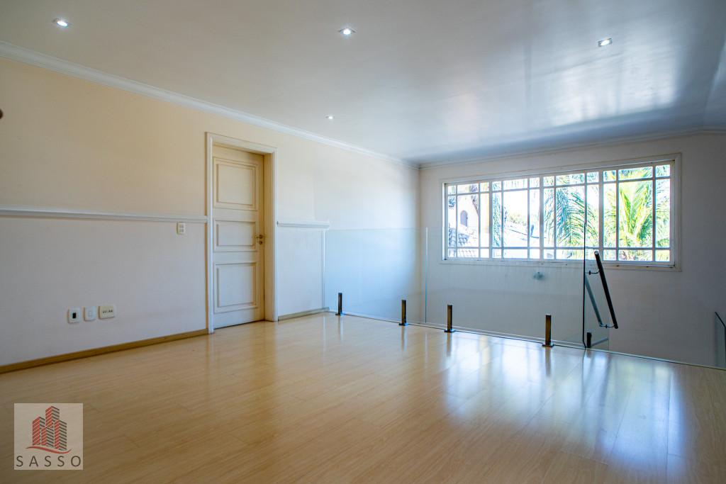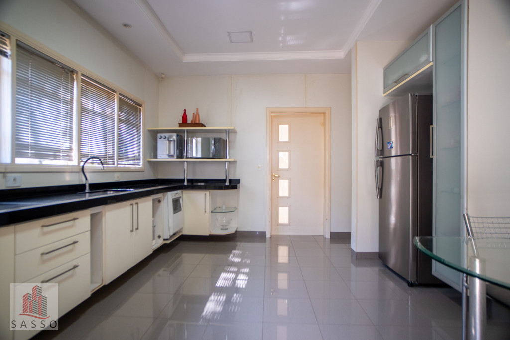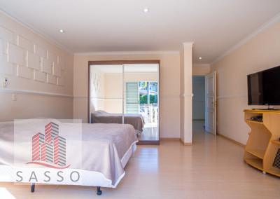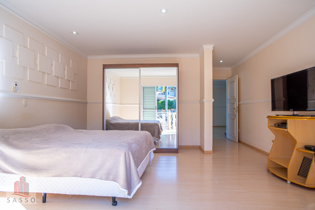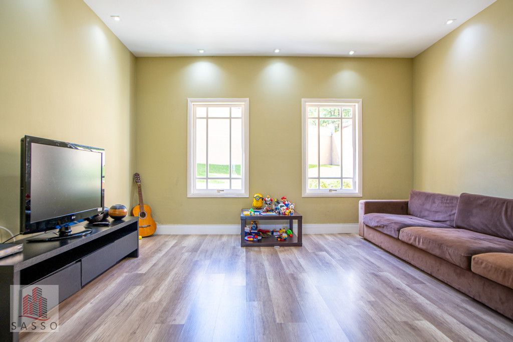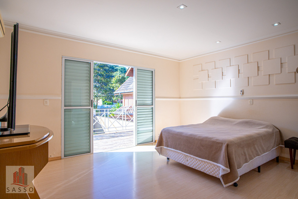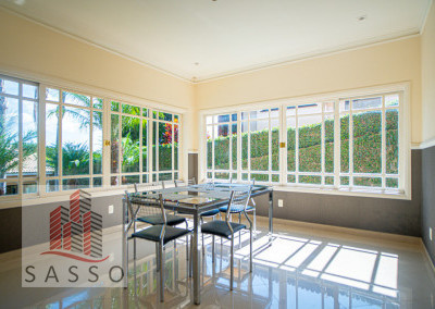 São 620 metros quadrados com 4 quartos suítes, sala de estar, varanda, cozinha, 6 banheiros, sala de lareira e 7 vagas de garagem