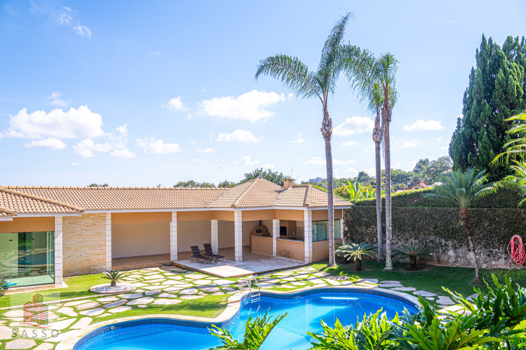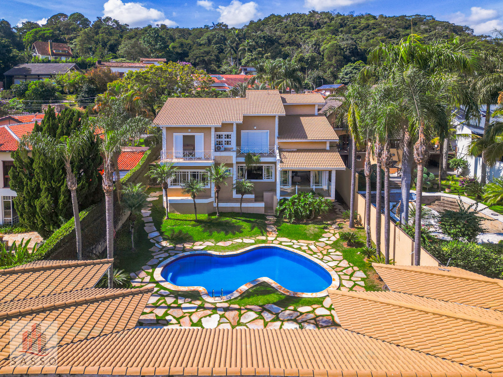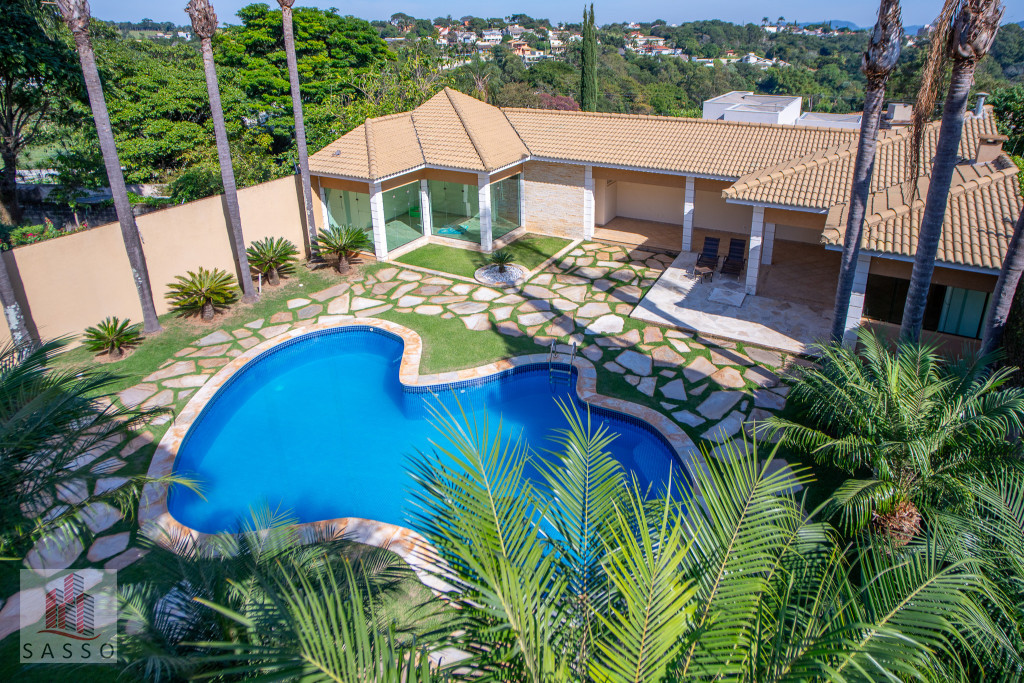 Linda casa com 4 quartos suítes, hall de entrada com pé direito alto, sala de estar com acesso a varanda, sala de lareira, cozinha com armários planejados, ar condicionado, varanda com vista panorâmica para a piscina, 6 banheiros, sauna úmida e 7 vagas de garagem