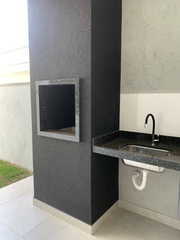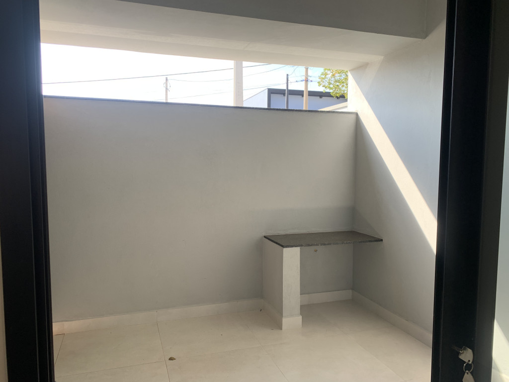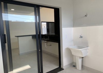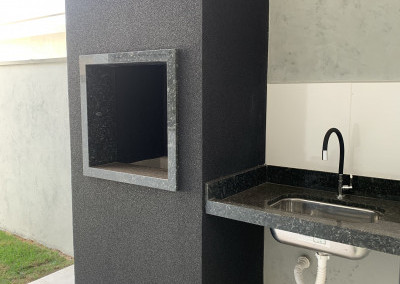 Área externa ampla, com churrasqueira, bem iluminada, e arejada.