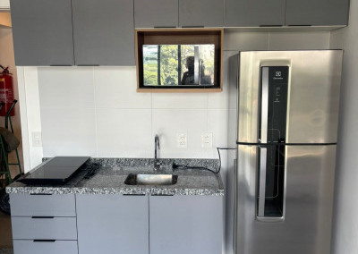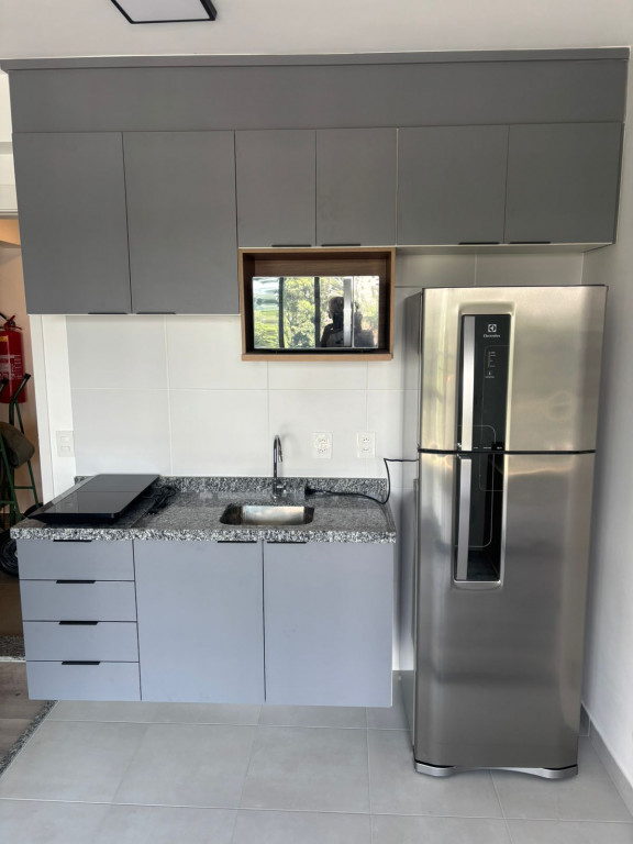 São 31 metros quadrados de área útil, com dormitório, banheiro, sala integrada, varanda, cozinha, repleto de móveis planejados, micro-ondas, e geladeira, apartamento nunca habitado.