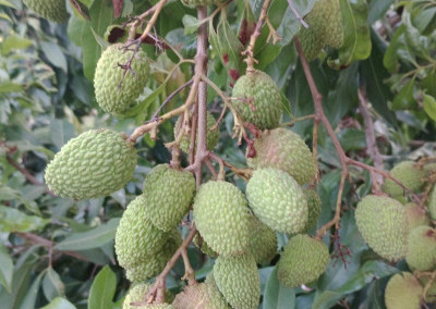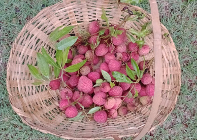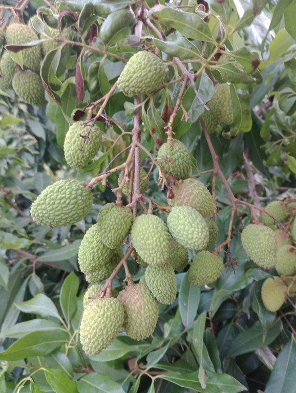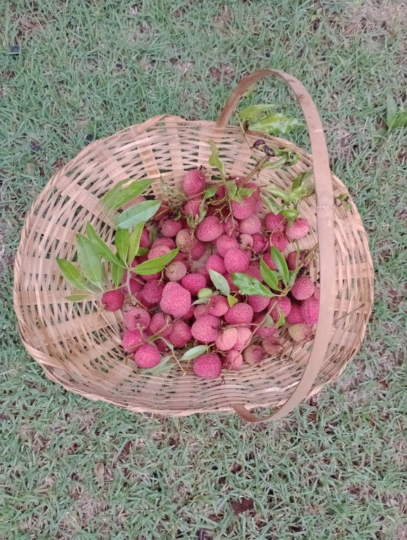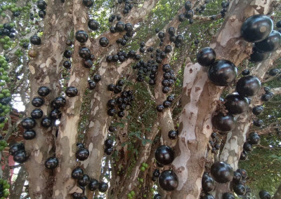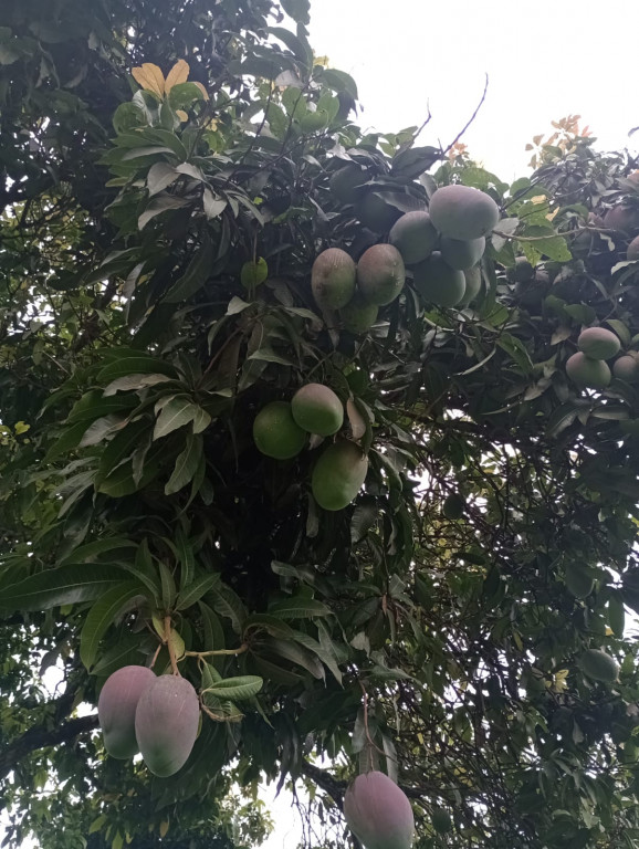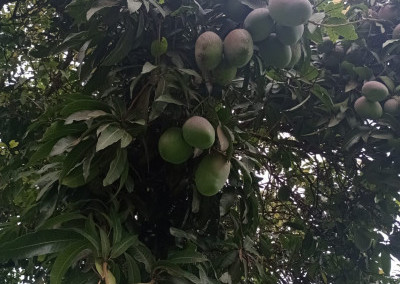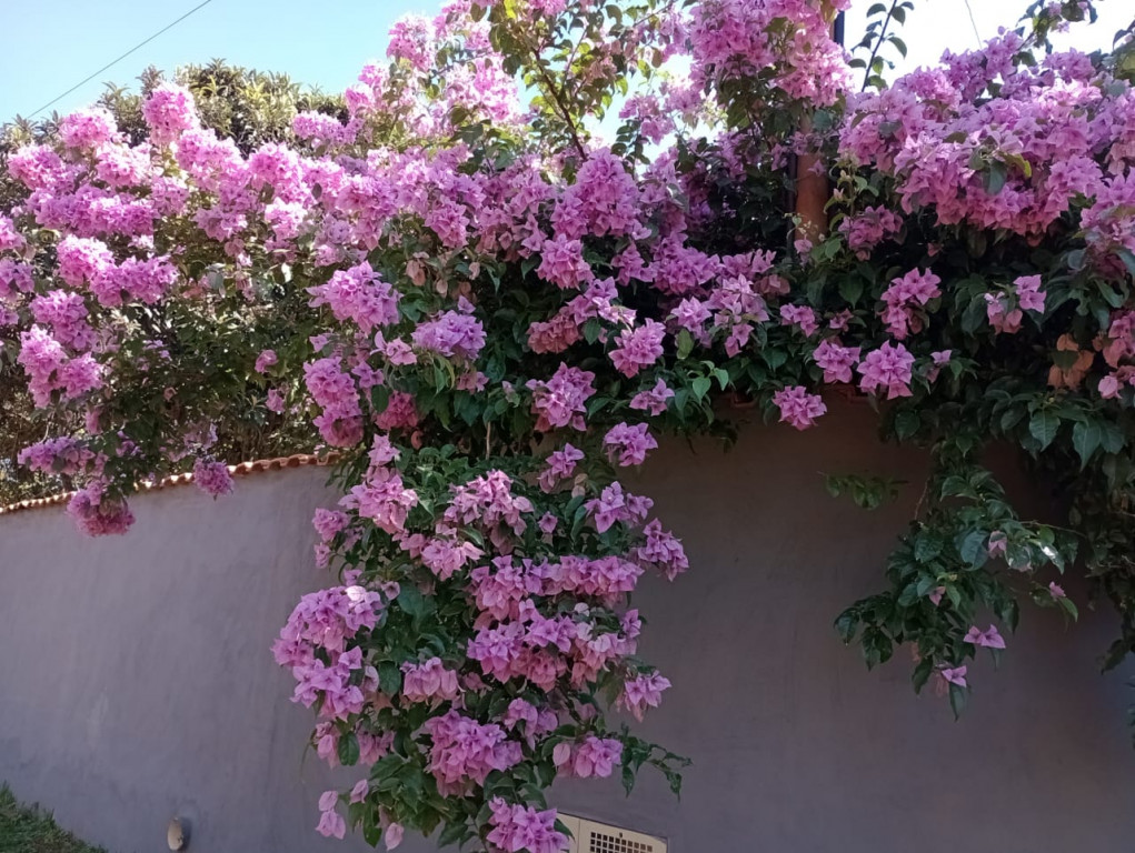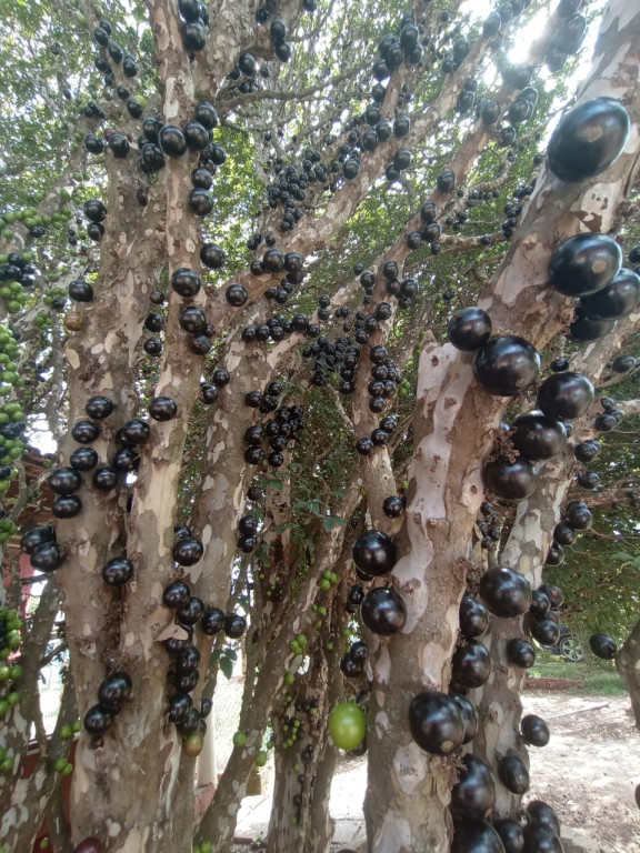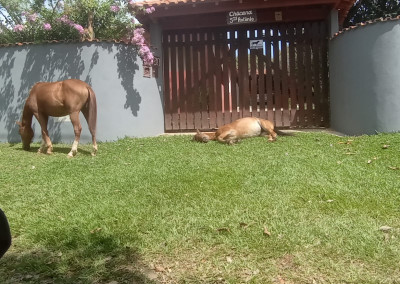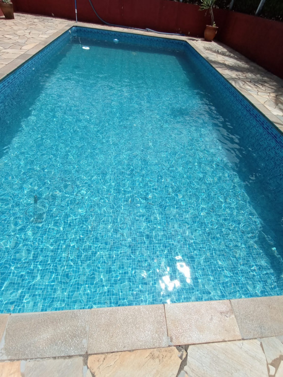 Área externa gramada ampla, com piscina, churrasqueira, área gourmet, pomar produzindo frutos, e canil.