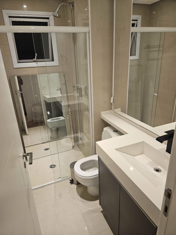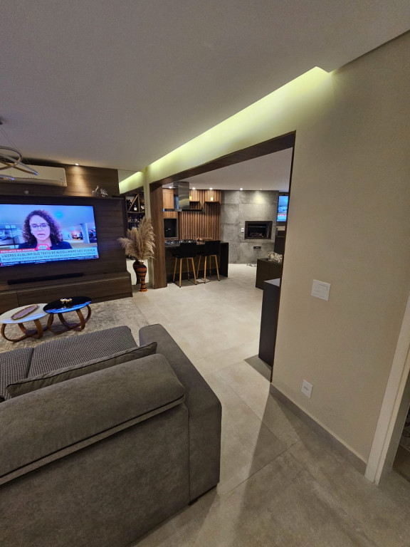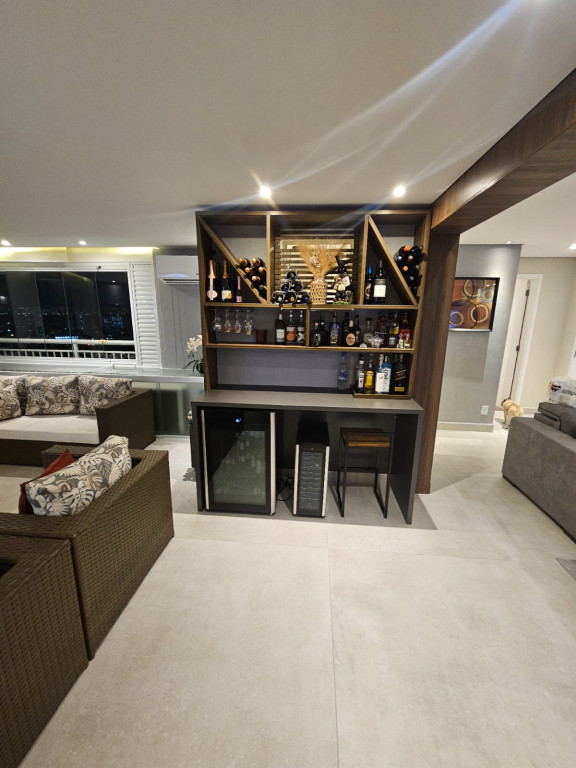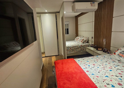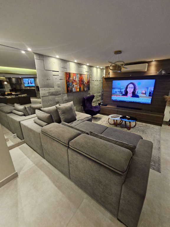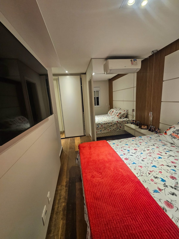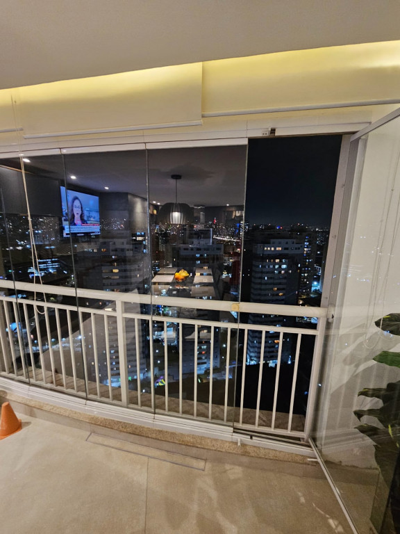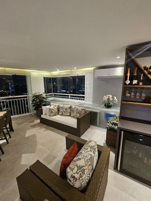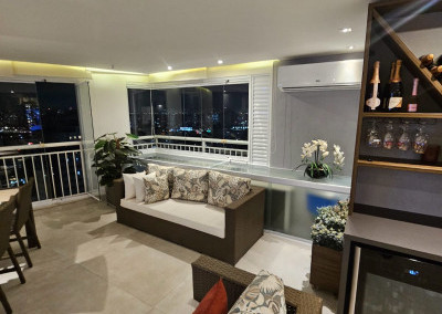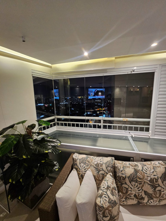 Apartamento com ar-condicionado em todos os cômodos, sacada envidraçada e nivelada, acabamento em gesso, luminárias embutidas, banheiro com box de vidro, cozinha estilo americana, com coocktop e coifa, banheiros reformados, aquecimento a gás, suítes com armários planejados, vagas grandes e separadas.