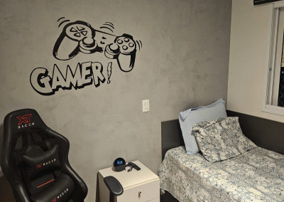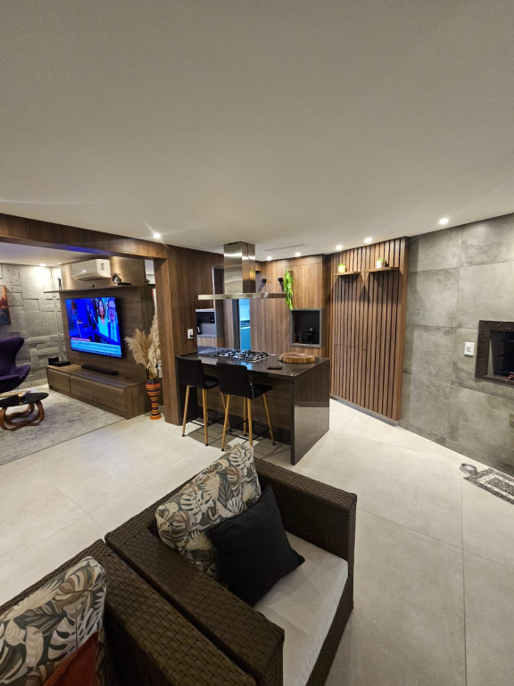São 122m² com 3 quartos sendo 3 suítes, sala com 2 ambientes, varanda gourmet, cozinha, 4 banheiros no total, área de serviço, e 2 vagas de garagem.
