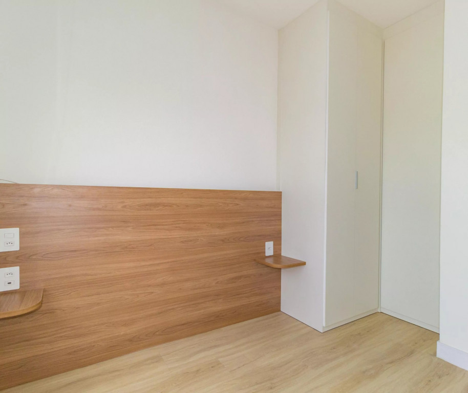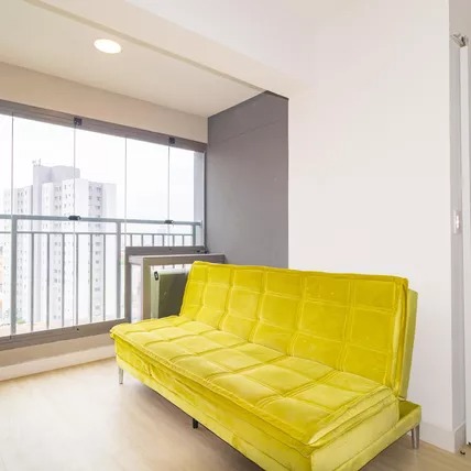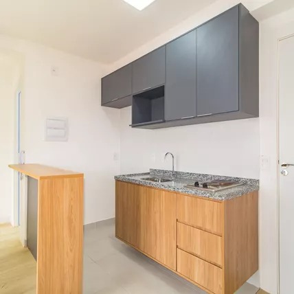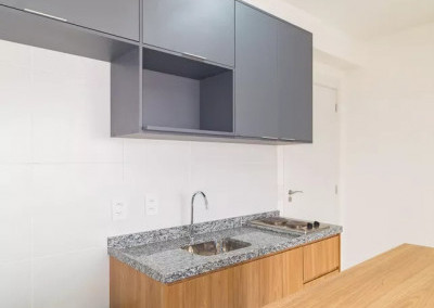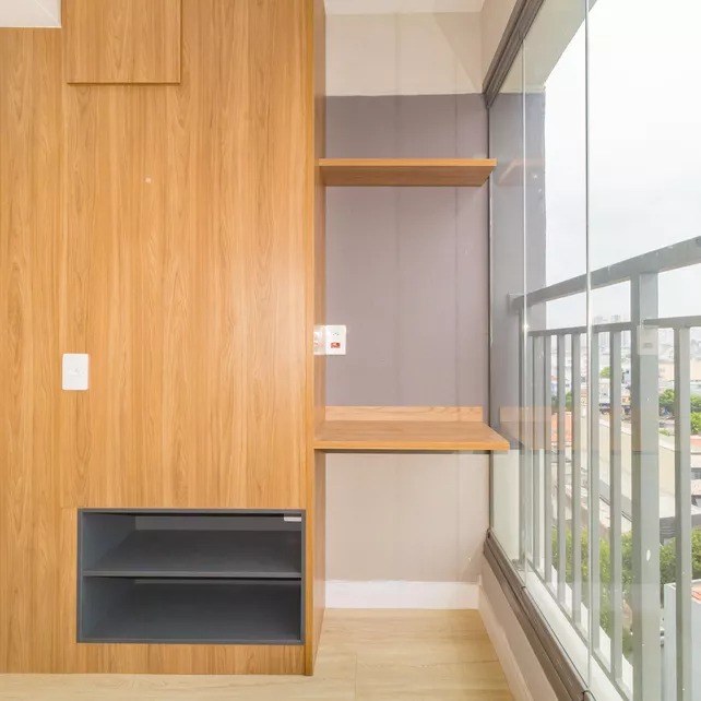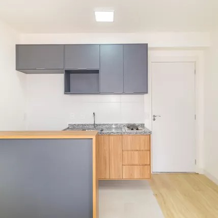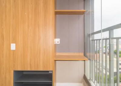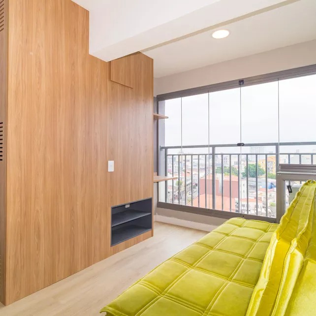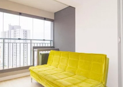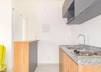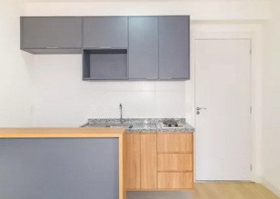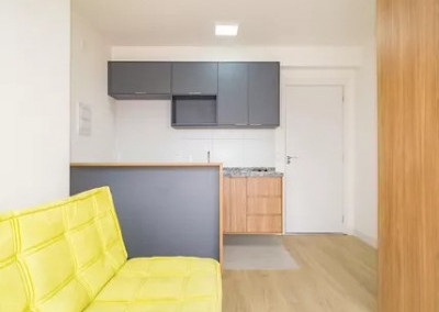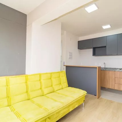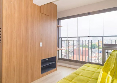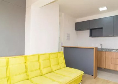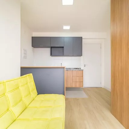 São 31 metros quadrados de área útil, com dormitório, banheiro, sala integrada, varanda, cozinha, repleto de móveis planejados, micro-ondas, e geladeira, apartamento nunca habitado.