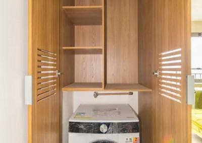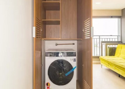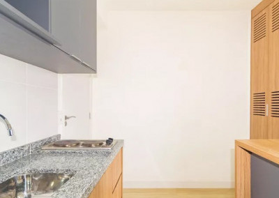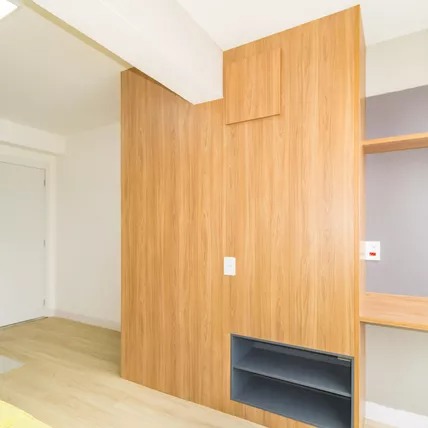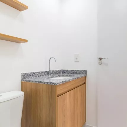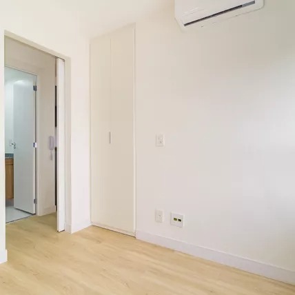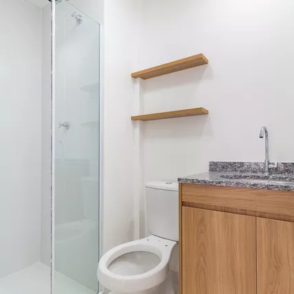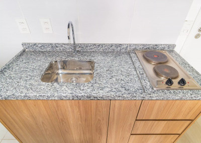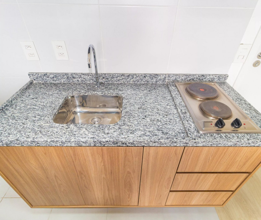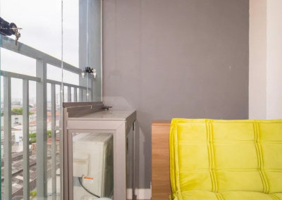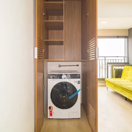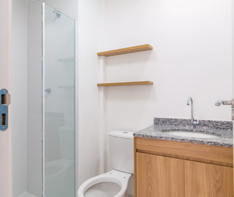 São 31 metros quadrados de área útil, com dormitório, banheiro, sala integrada, varanda, cozinha, repleto de móveis planejados, micro-ondas, e geladeira, apartamento nunca habitado.