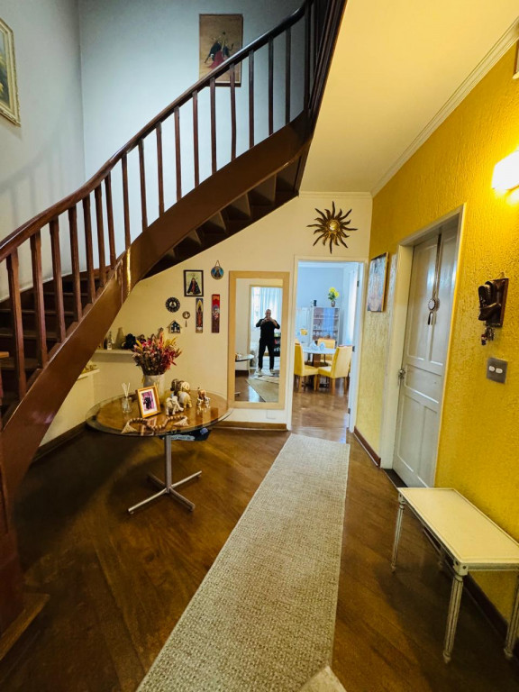 São 300m² sendo 250m² de área construída, com 10m² de frente por 30m² de fundos, com 7 salas, 6 banheiros, copa, cozinha, corredor lateral, 6 vagas de garagem, quintal, lavanderia e despensa.