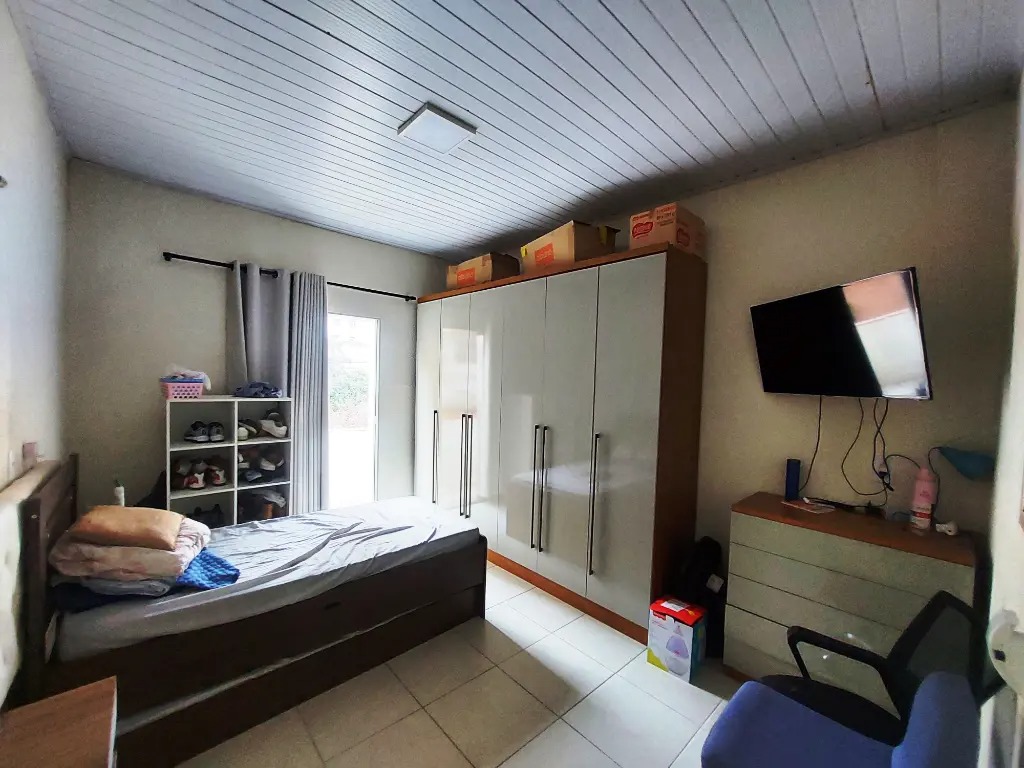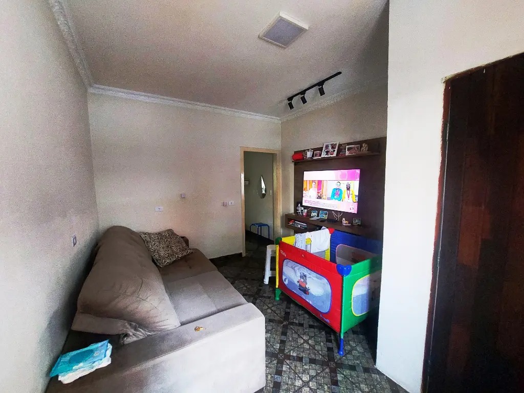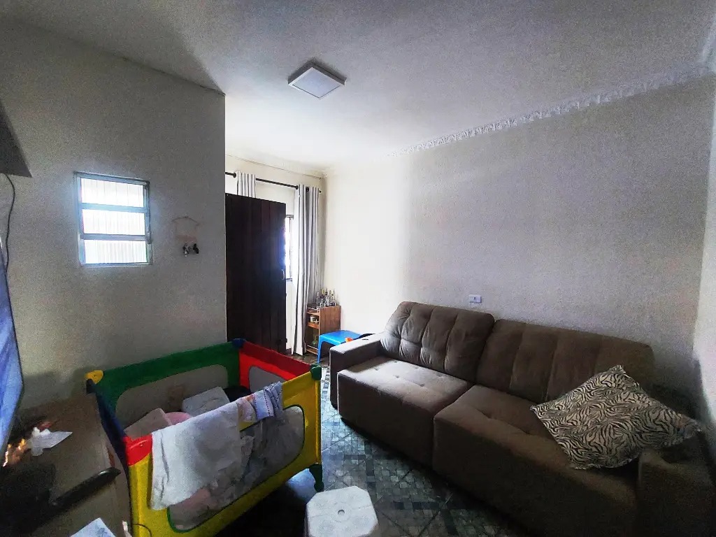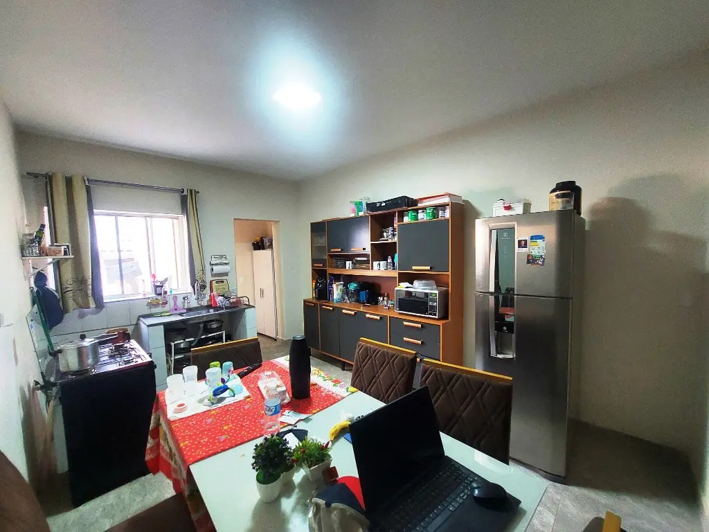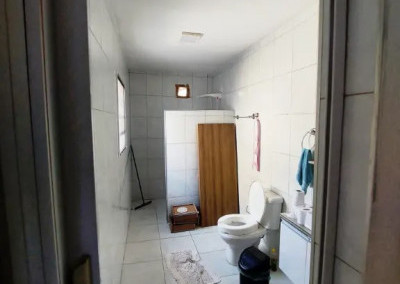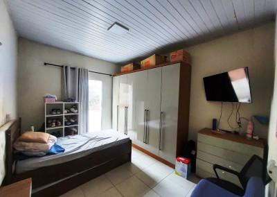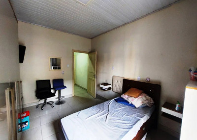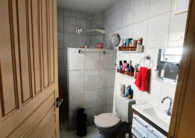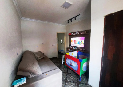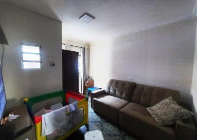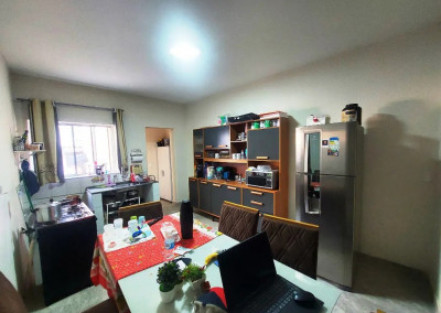 São 100 metros quadrados de área construída, com 4 metros de frente, e19 metros de fundos, com 2 dormitórios, 2 banheiros, sala para dois ambientes, varanda, quintal, cozinha e área de serviço.