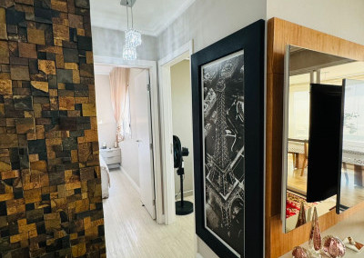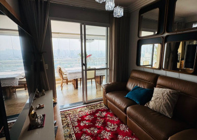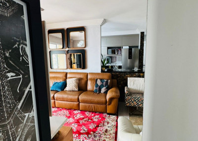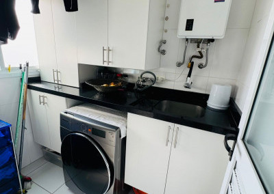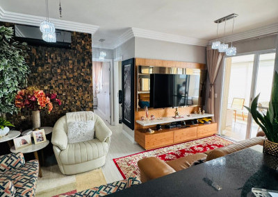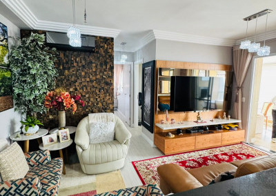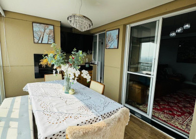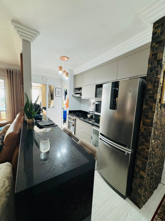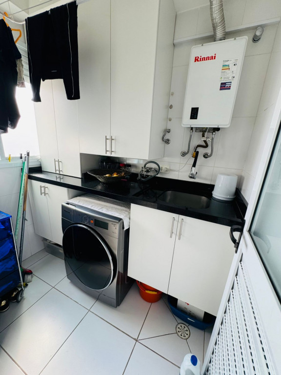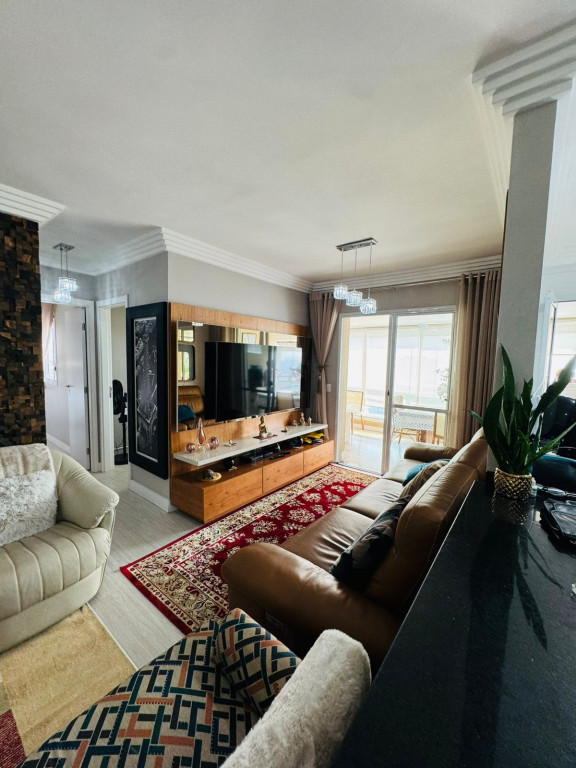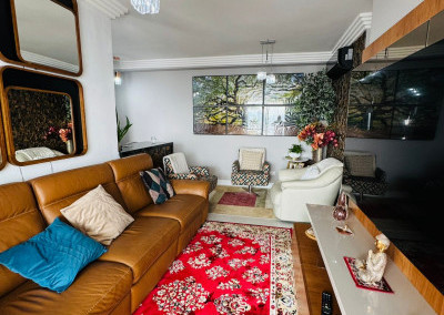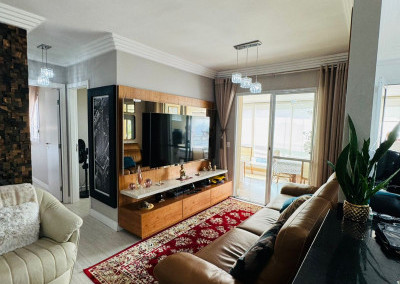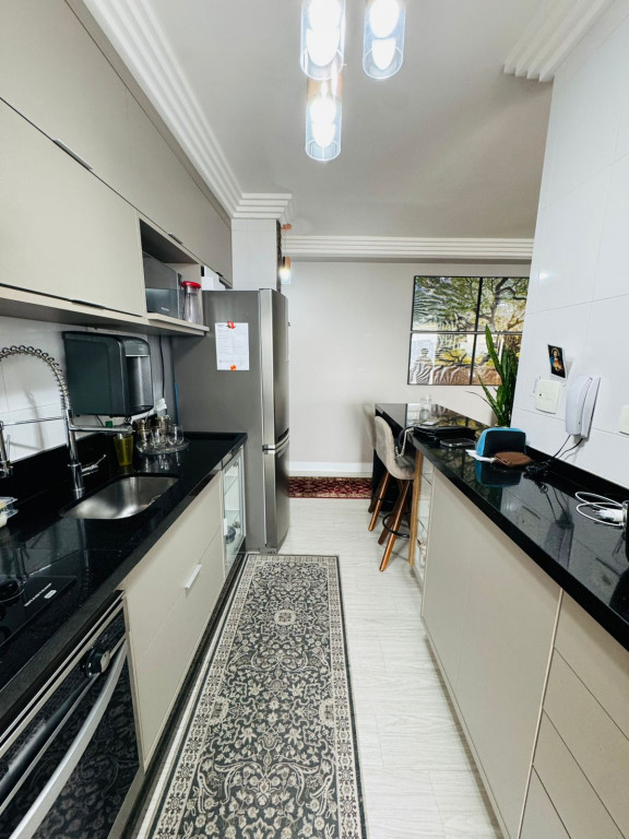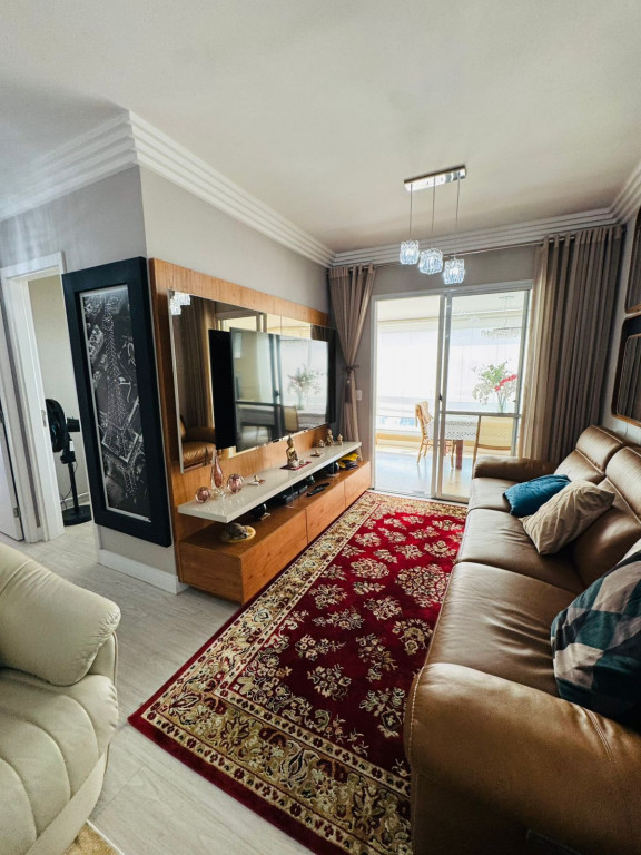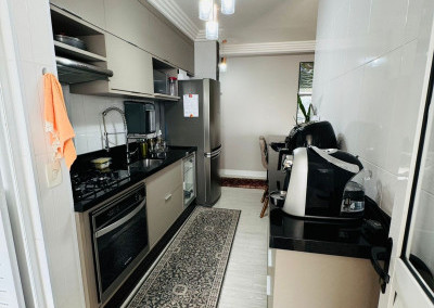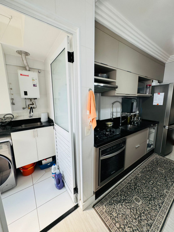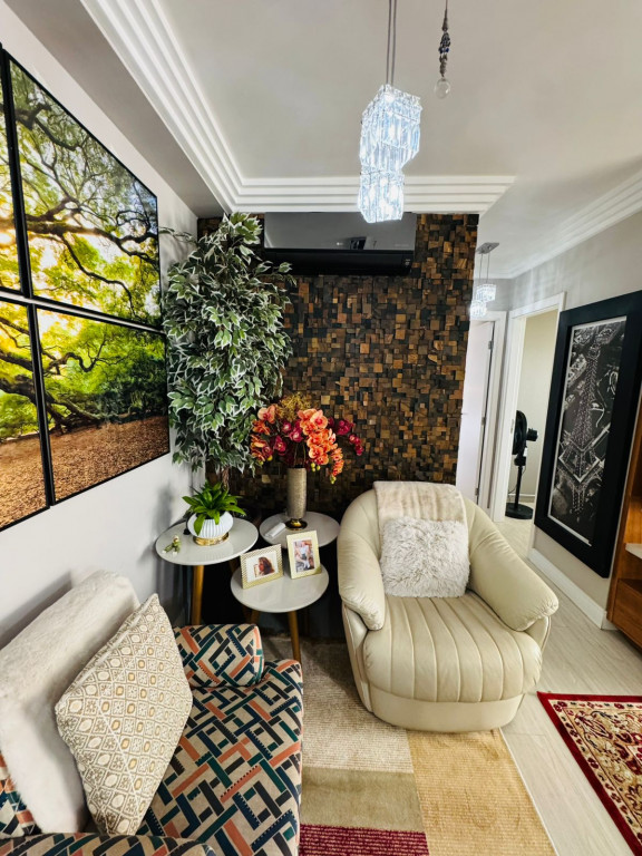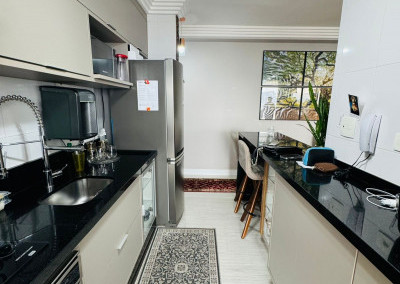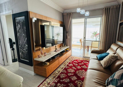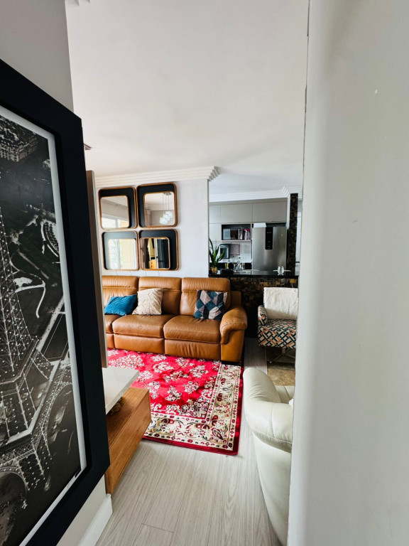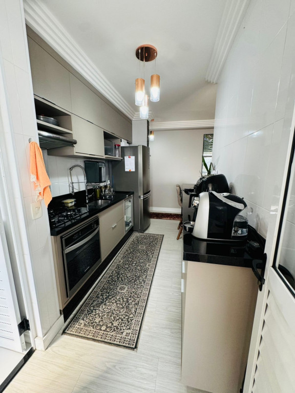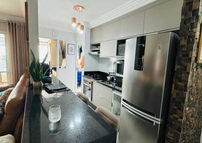 São 72m² com 2 quartos sendo 1 suíte, 2 banheiros, sala com 2 ambientes e varanda, cozinha, área de serviços e 2 vagas de garagem.