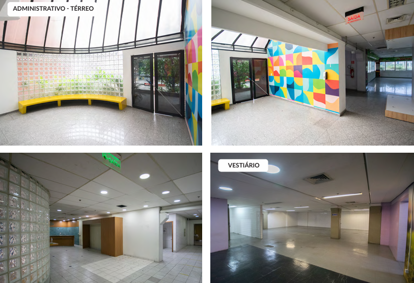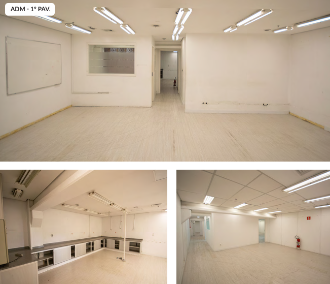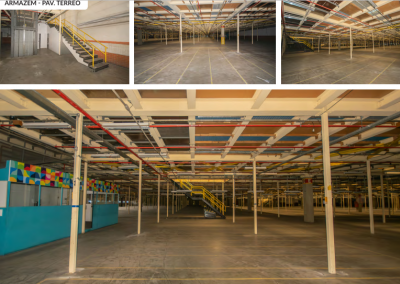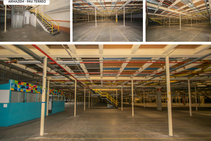 Galpão encontra-se com mezanino, sendo térreo de 4 metros de pé direito, e primeiro andar com 6 metros de pé direito, podendo tirar todo o mezanino por conta do proprietário, voltando aos 12 metros totais de pé direito.