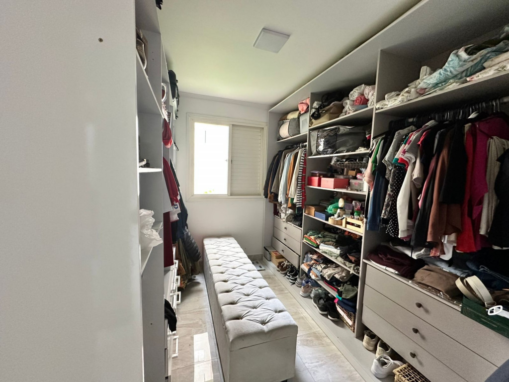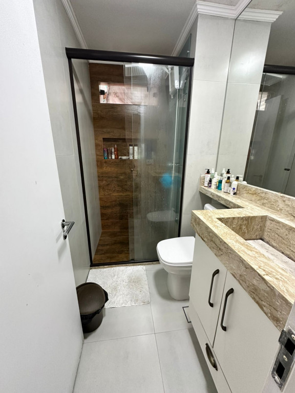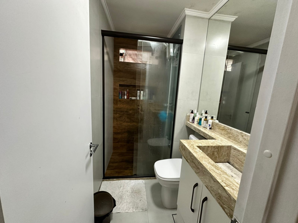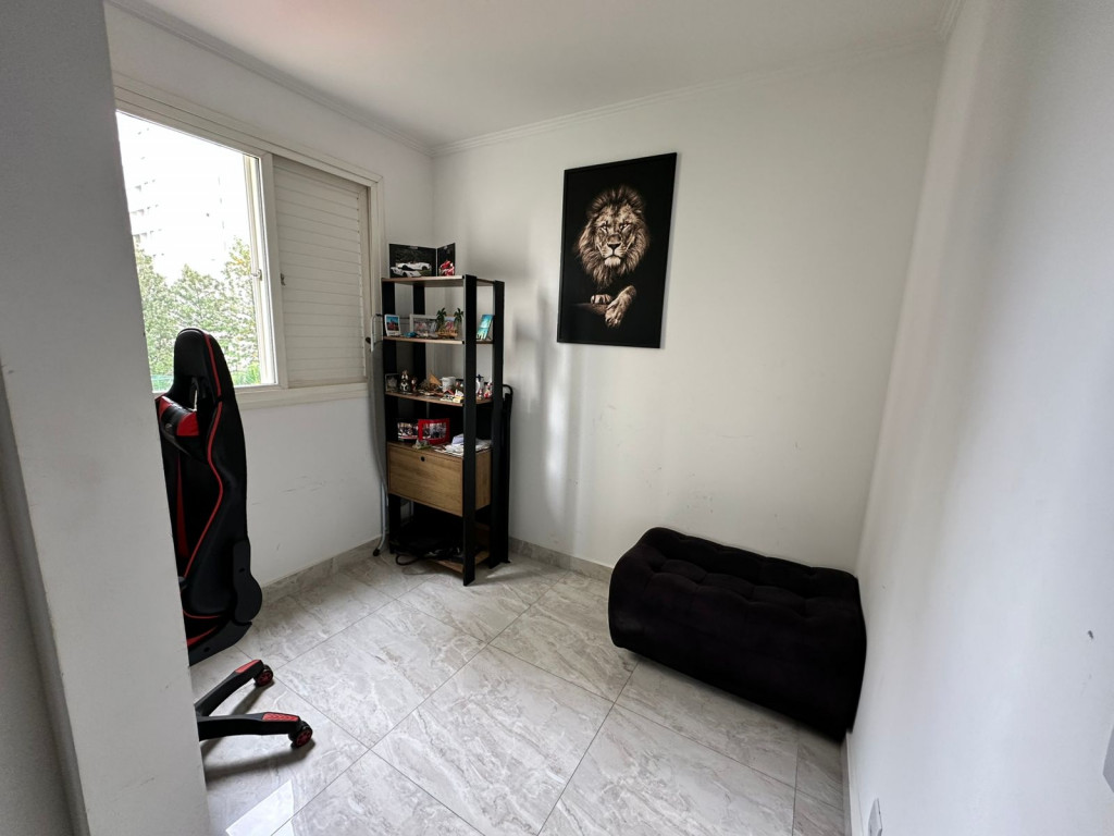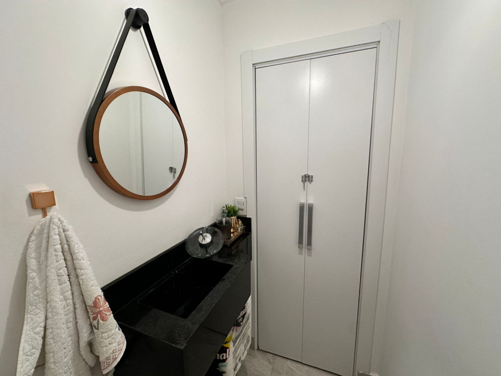 Apartamento com sacada envidraçada, cozinha estilo americano, com armários planejados, área de serviço com porta, lavabo, banheiros reformados com box de vidro, 1 dos dormitórios transformado em closet, piso em porcelanato e luminárias em led.