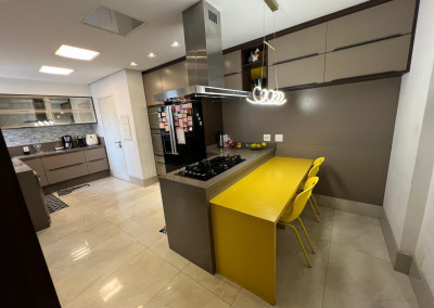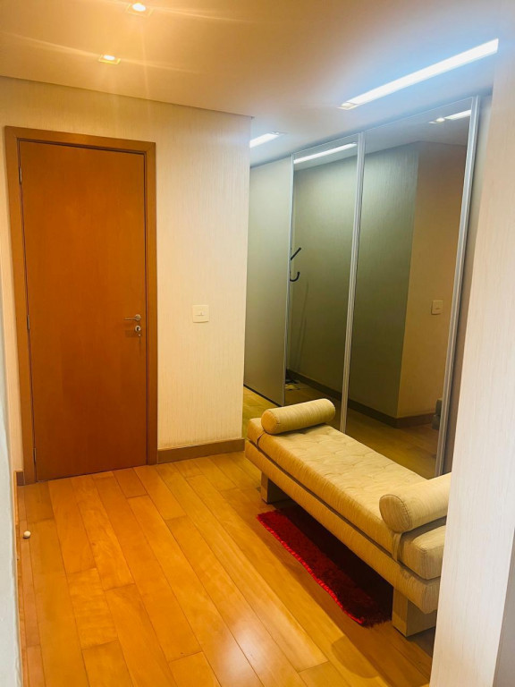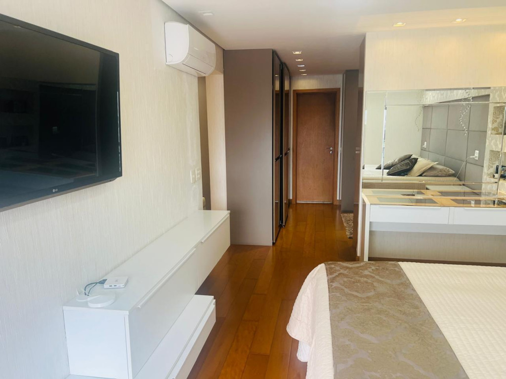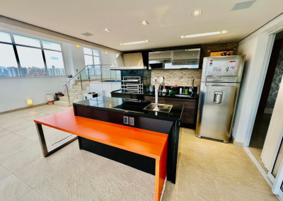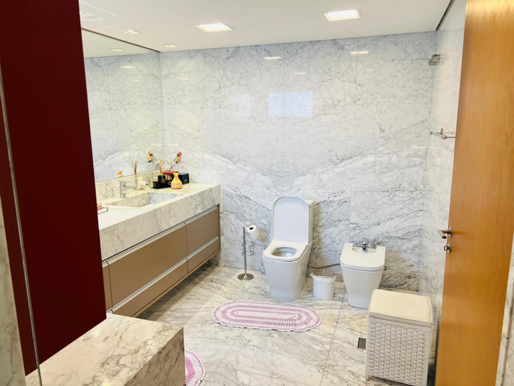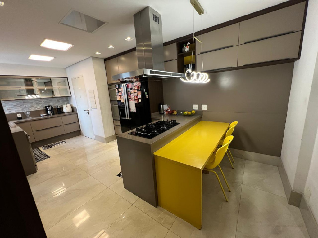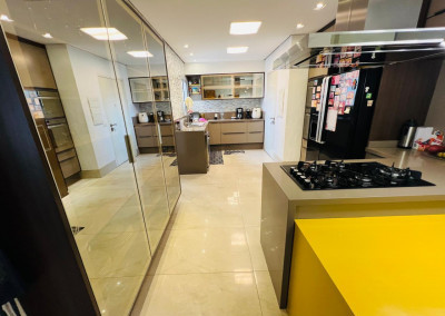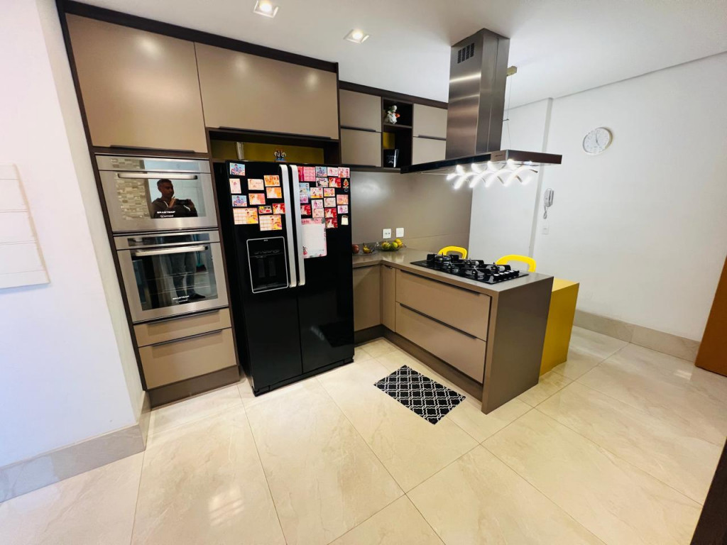 Quatro suítes com mobiliário completo, sala dois ambientes, cozinha planejada com fogão, geladeira, e micro-ondas, área de serviços com banheiro, deposito, lavabo, e escritório.