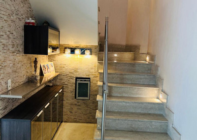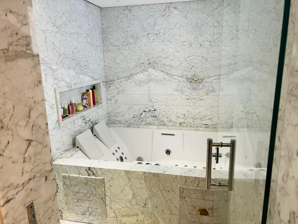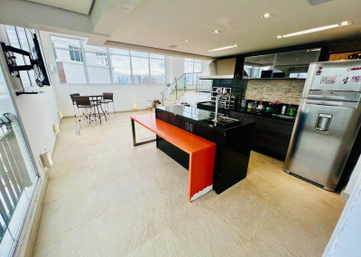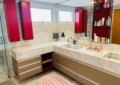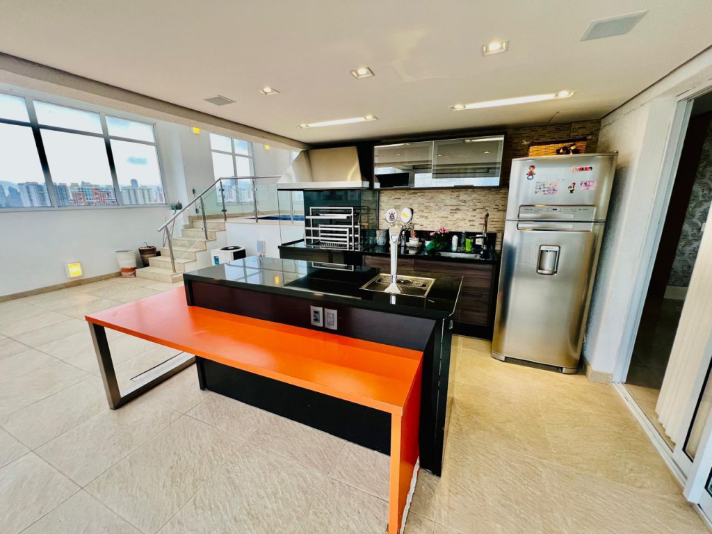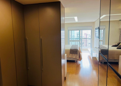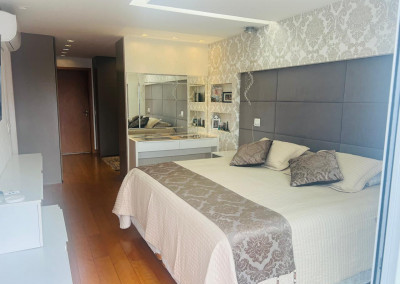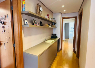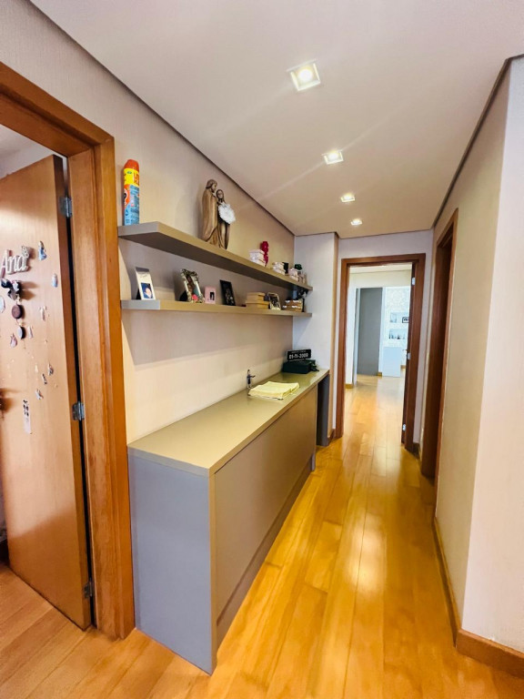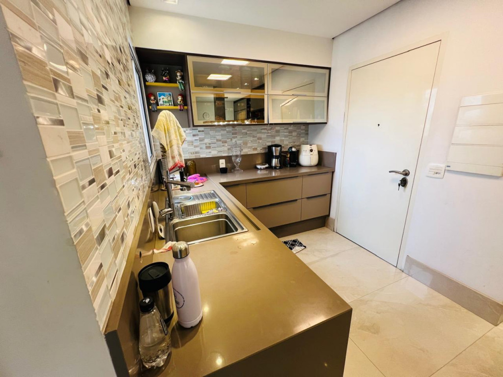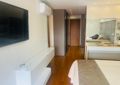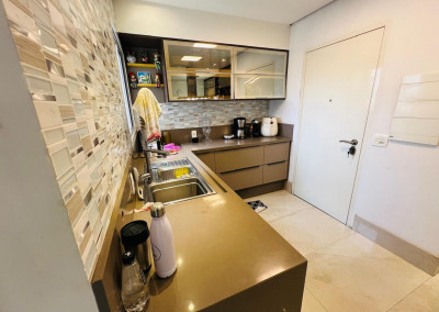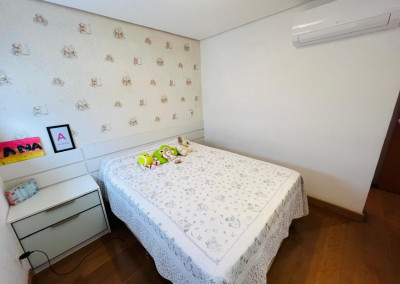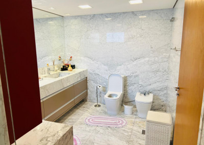 Quatro suítes com mobiliário completo, sala dois ambientes, cozinha planejada com fogão, geladeira, e micro-ondas, área de serviços com banheiro, deposito, lavabo, e escritório.