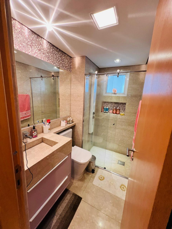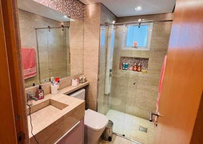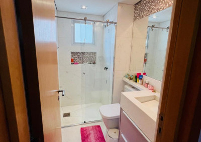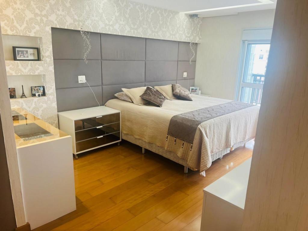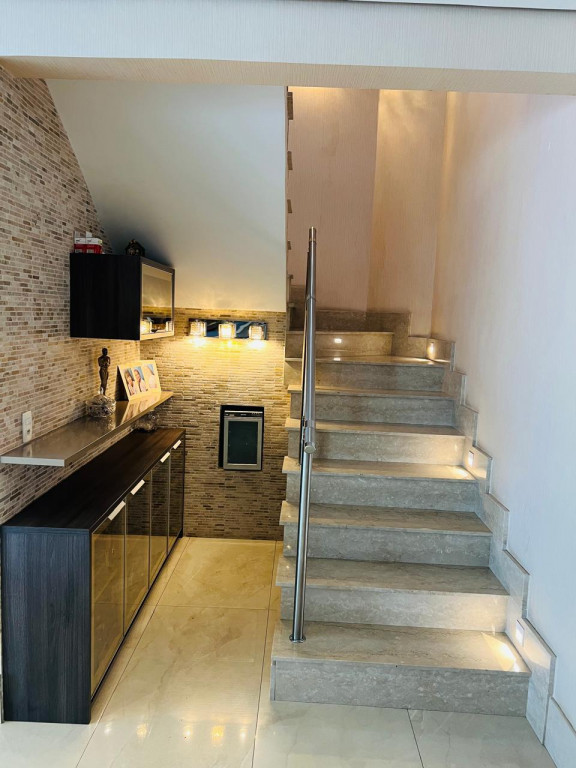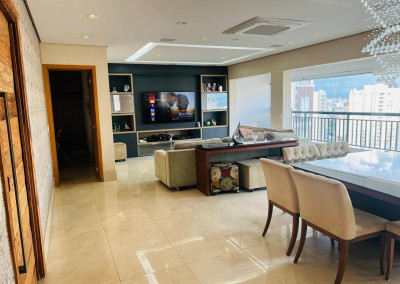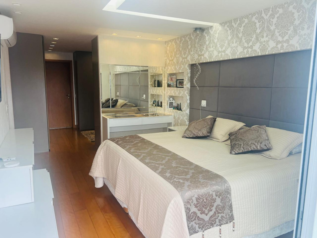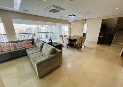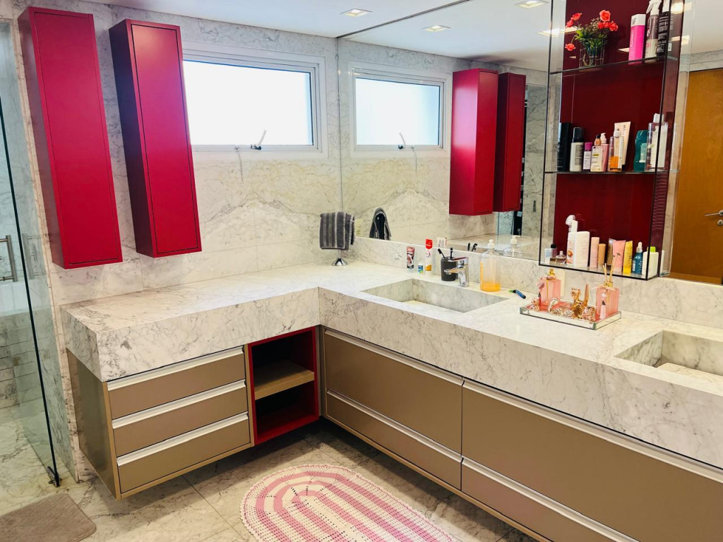 São 340 m² com 4 dormitórios sendo 4 suite, sala com 2 ambientes, cozinha, 6 banheiros no total, área de serviços e 4 vagas de garagem.