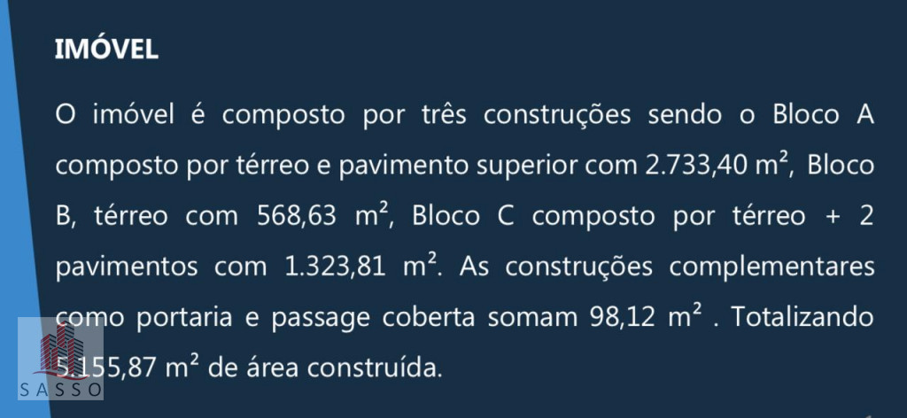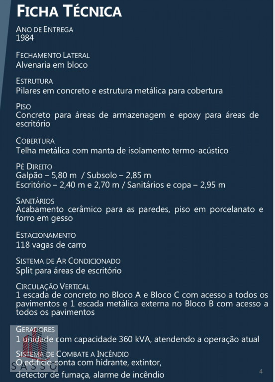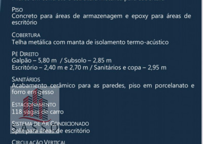 São 5.155 M² de terreno, sendo aproximadamente 2500 M² de área administrativa, e 2.600 M² de deposito, pés direitos de 5,80 M, subsolo de 2,85, escritório de 2,40 e 2,70 M, 118 vagas, dividido em 3 blocos, 25 salas, e 16 banheiros, gerador com capacidade de 360 kVA, contrato de 4 anos, sem multa para devolução, antecipada, próximo ao rodoanel, bandeirantes, anhanguera, marginal tiete.