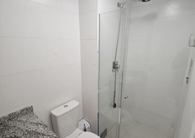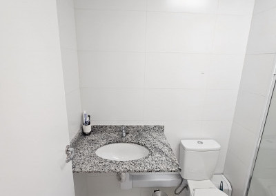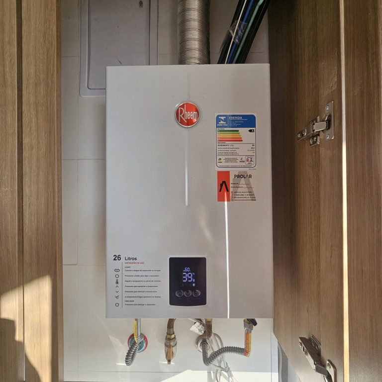 Aquecedor a gás 26L da marca Rheem e duchas Docol TechnoShower com monocomandos nos banheiros.