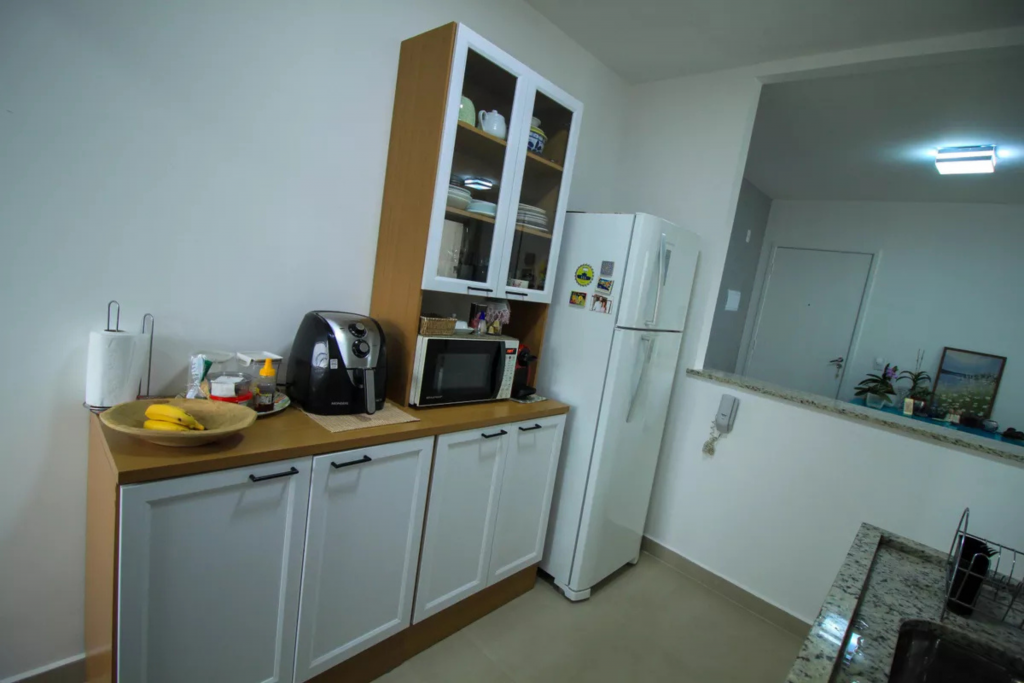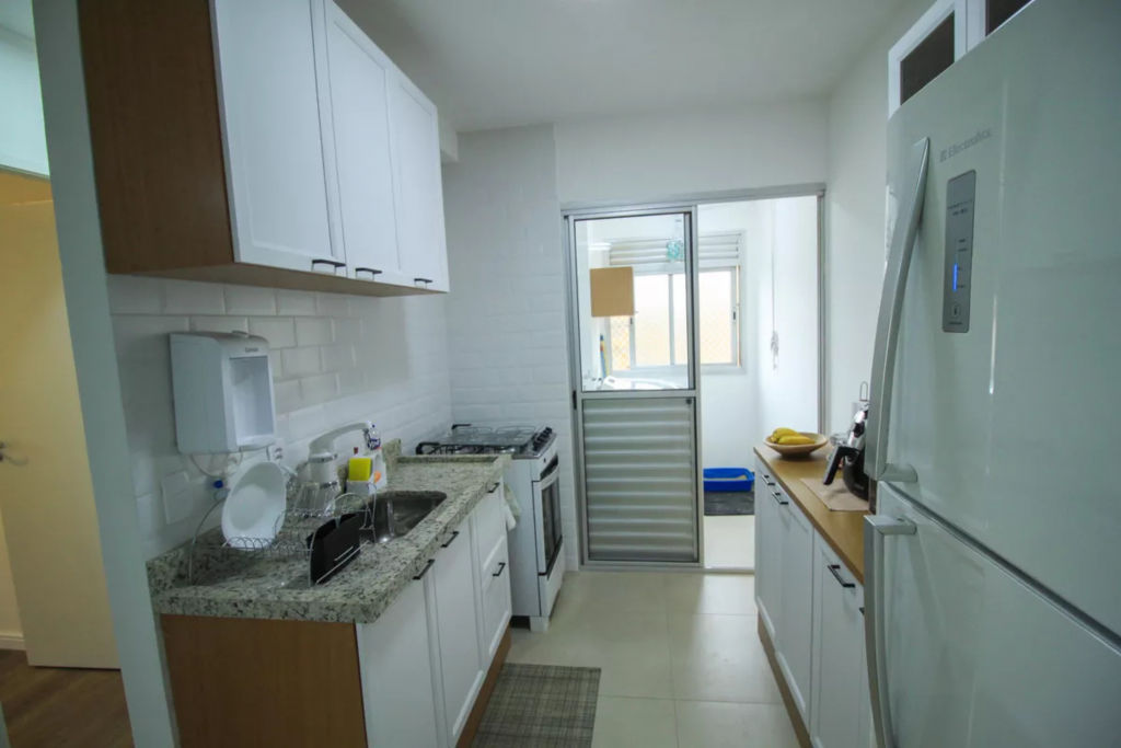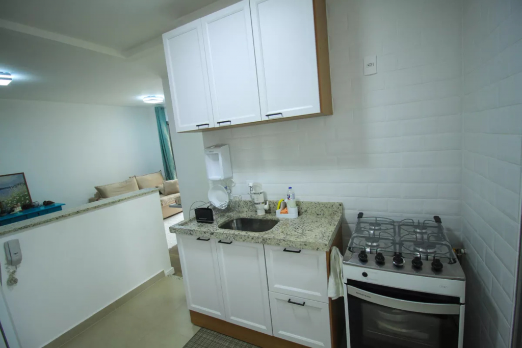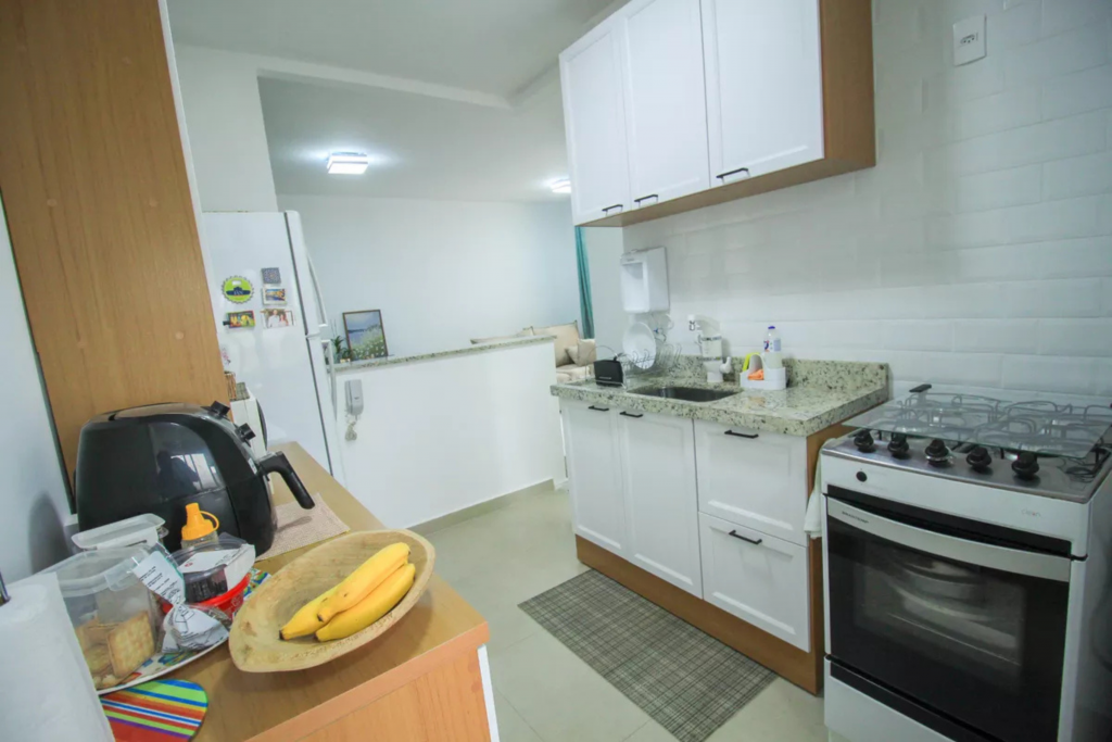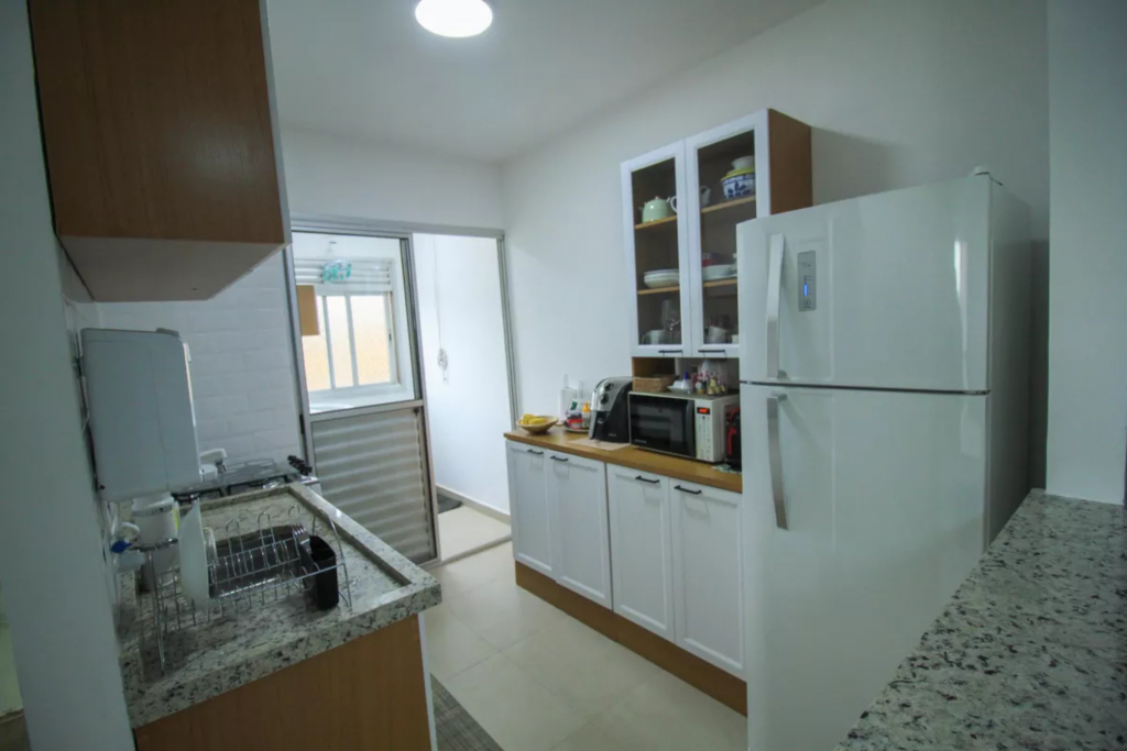 São 50 m² com 2 quartos, sala para 2 ambientes, cozinha, área de serviço e 1 vaga de garagem.