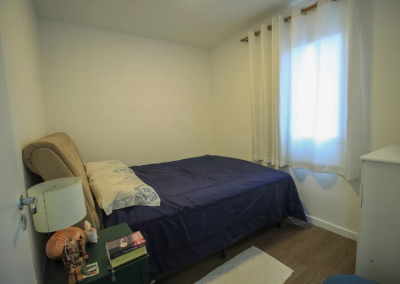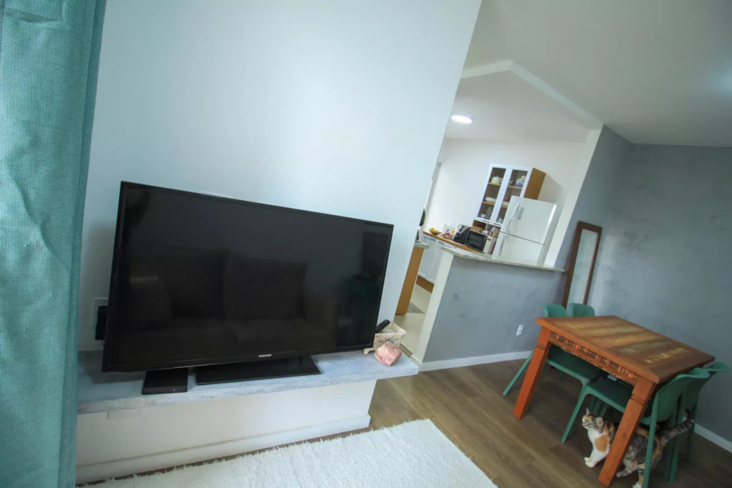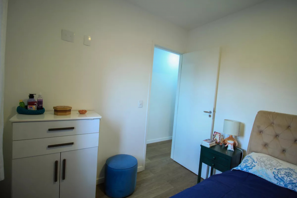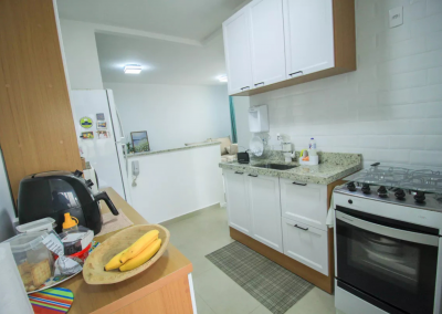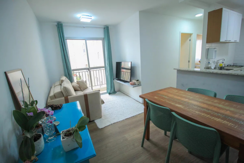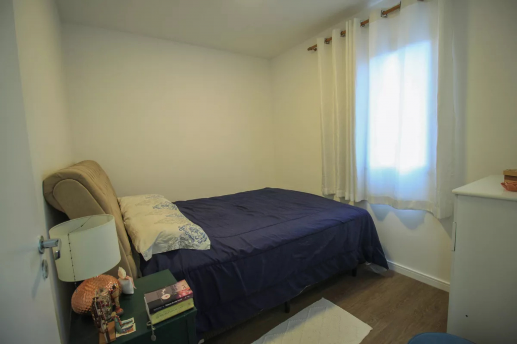 São 50 m² com 2 quartos, sala para 2 ambientes, cozinha, área de serviço e 1 vaga de garagem.