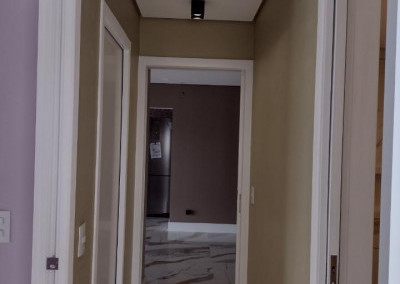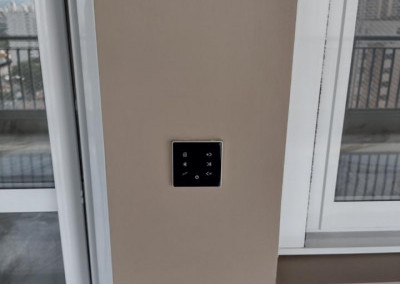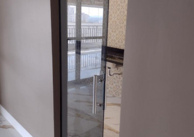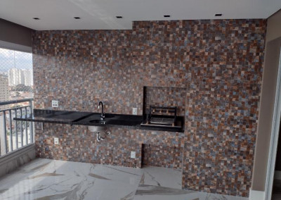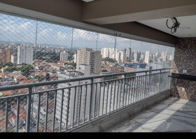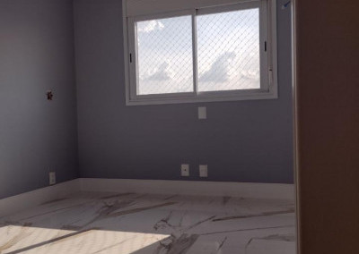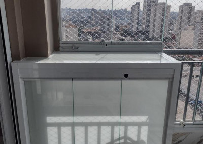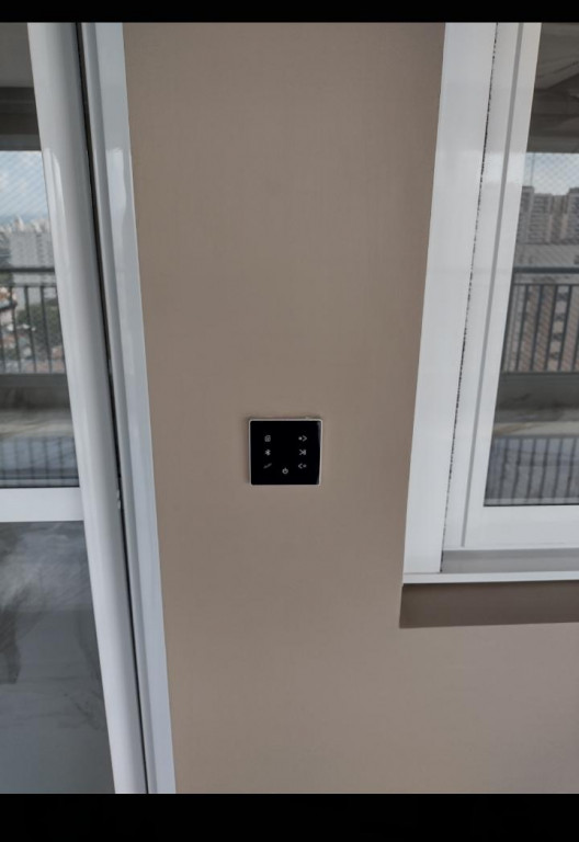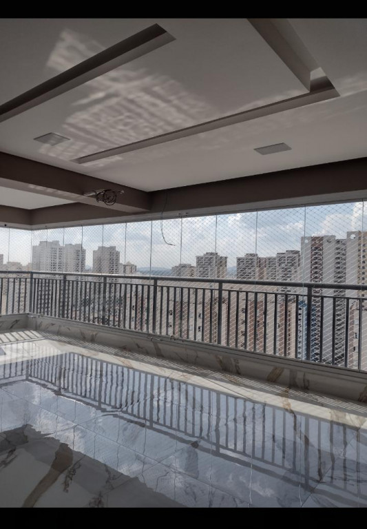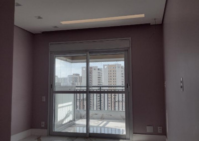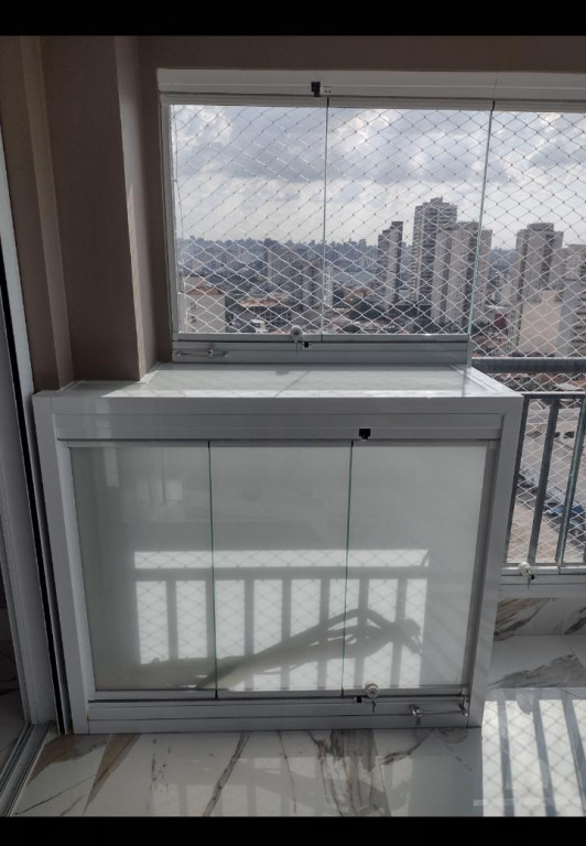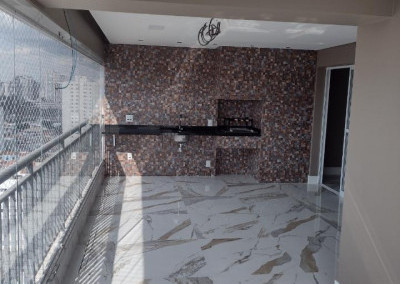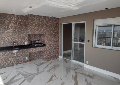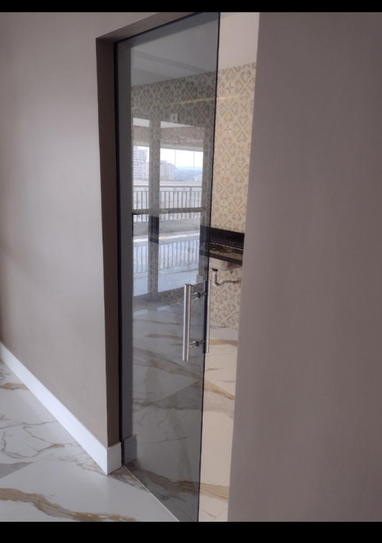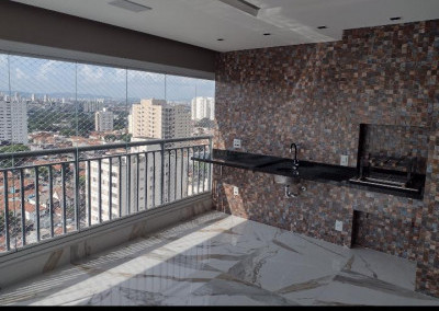 Fechadura digital na entrada social, varanda gourmet com gabinete para condensadora do ar condicionado. Envidraçamento e cortinas blackout