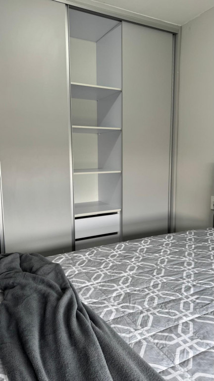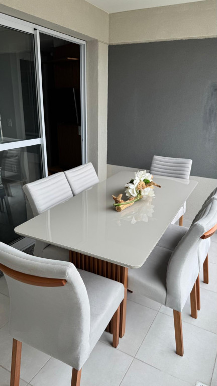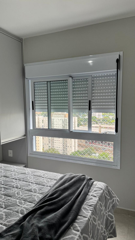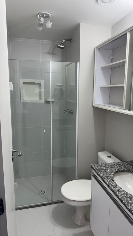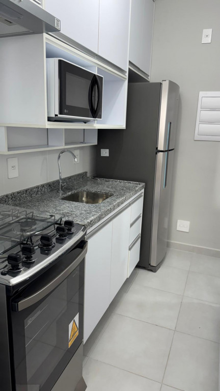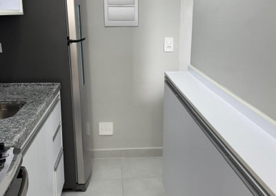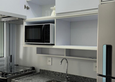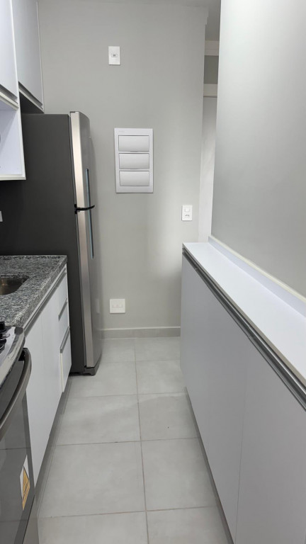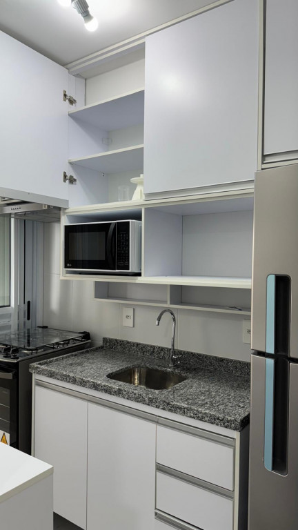 São 48 metros quadrados de área útil, com 2 dormitórios, banheiro, sala integrada, varanda, cozinha, repleto de móveis planejados, micro-ondas, e geladeira, apartamento nunca habitado.