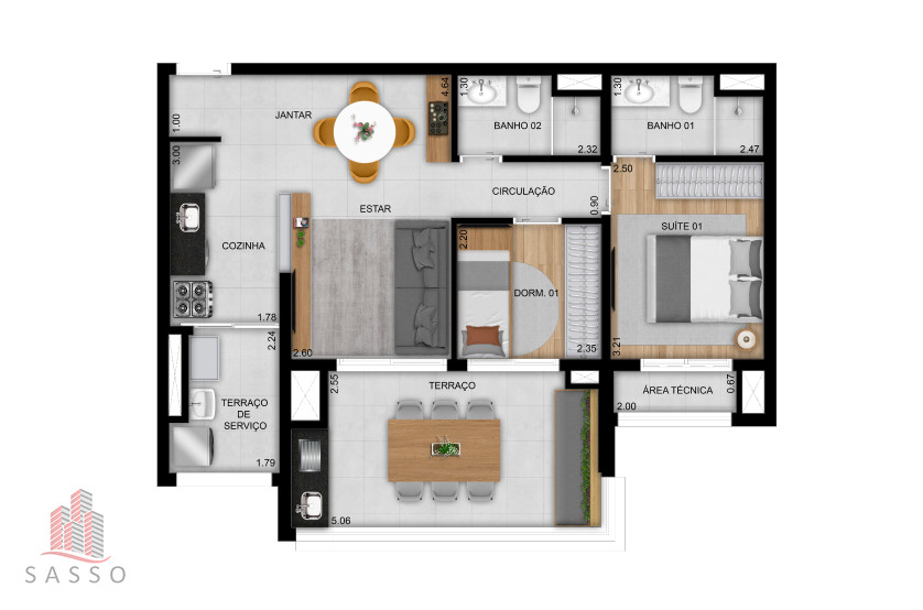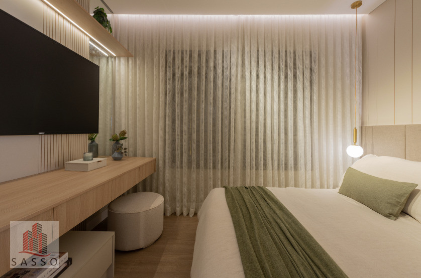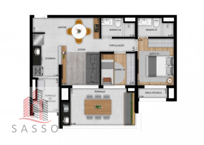 São 69 M² de área útil com 2 quartos sendo 1 suíte, 2 banheiros, cozinha, área de serviço, 1 vaga de garagem.