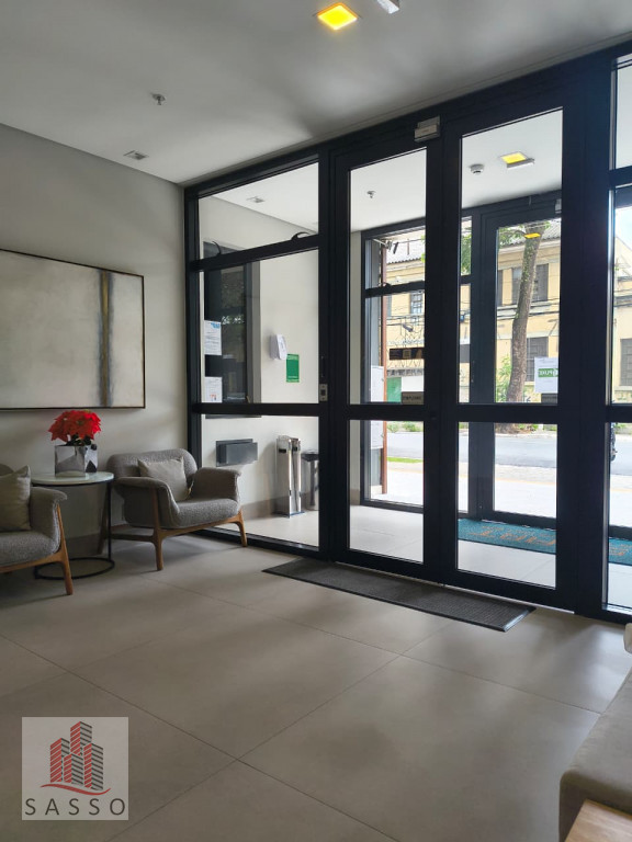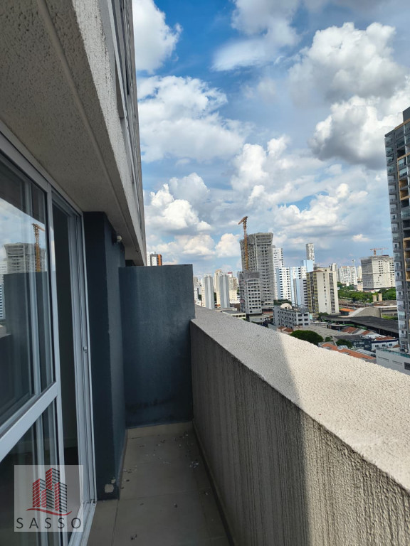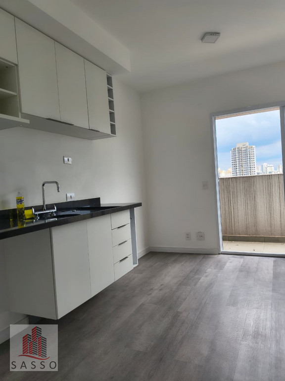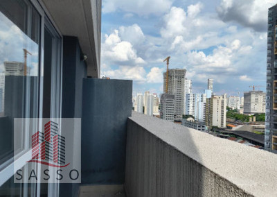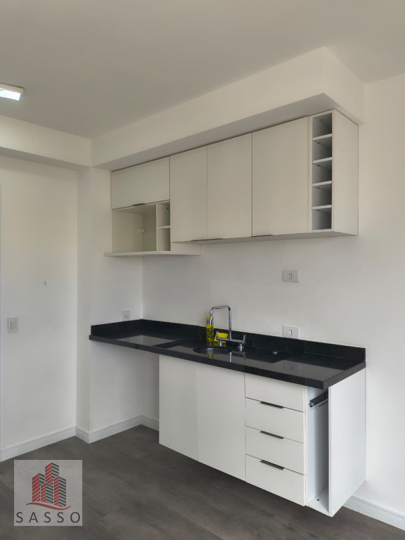 Studio possui 21m², com 1 quarto, sala, cozinha e banheiro.