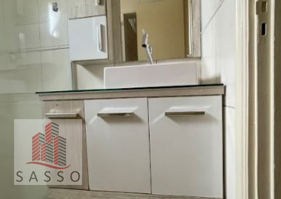 São 65 M², com 2 quartos, 1 banheiro, cozinha, área de serviço, e 1 vaga de garagem, cômodos amplos, bem iluminados, e bem arejados, piso laminado, armários de cozinha, e gabinete no banheiro.