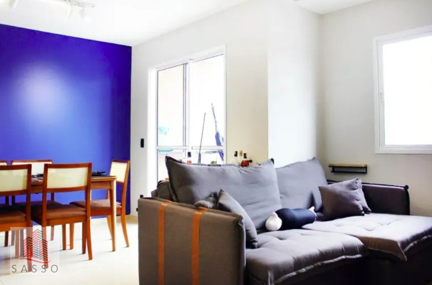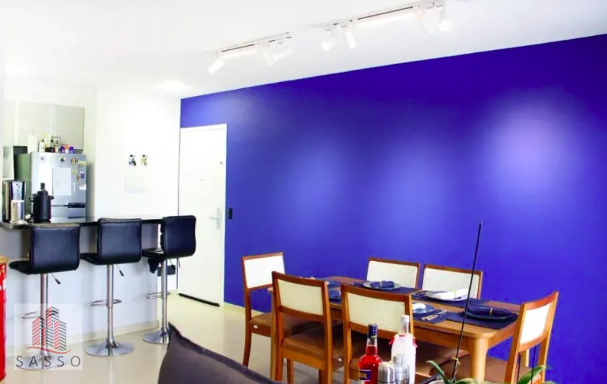 São 65 metros quadrados com 3 quartos, sala para 2 ambientes, cozinha, área de serviço, banheiro social e 1 vaga de garagem.
