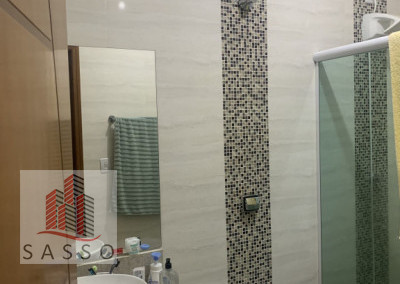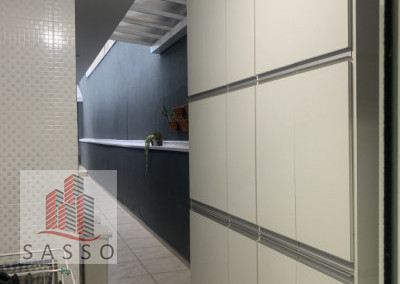 São 155 metros quadrados com 3 quartos, sala para 2 ambientes, cozinha, área de serviço, banheiro social e garagem com 2 vagas