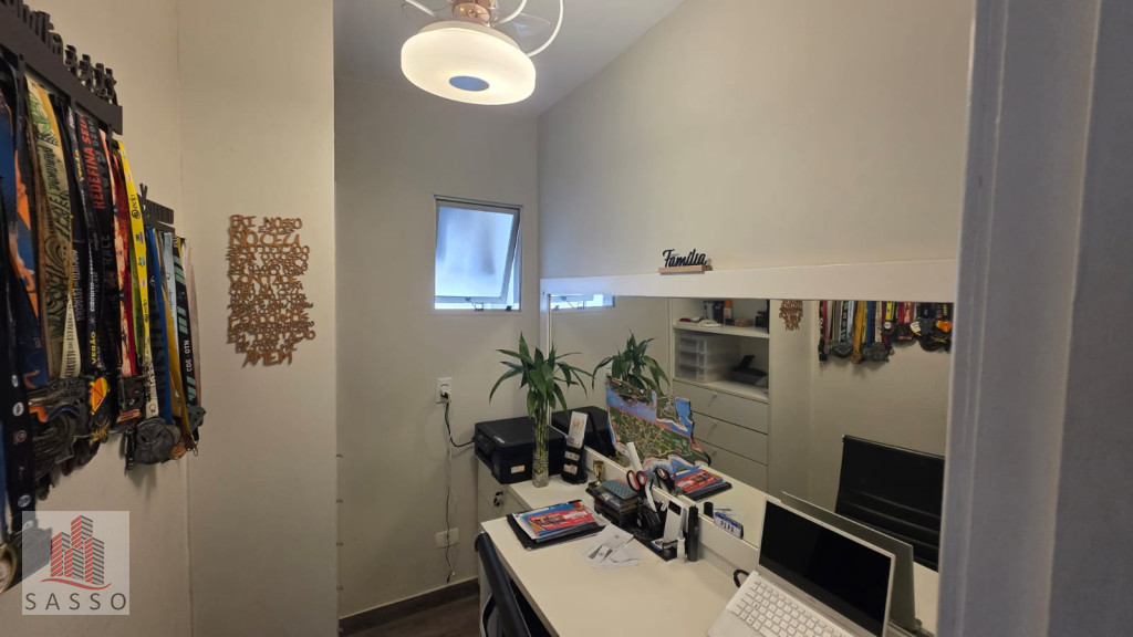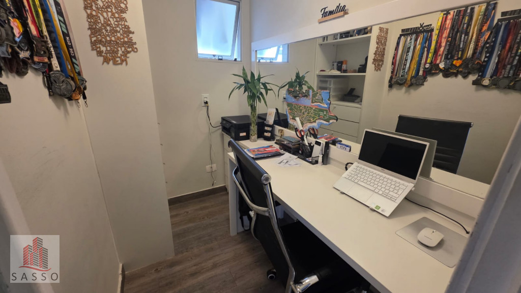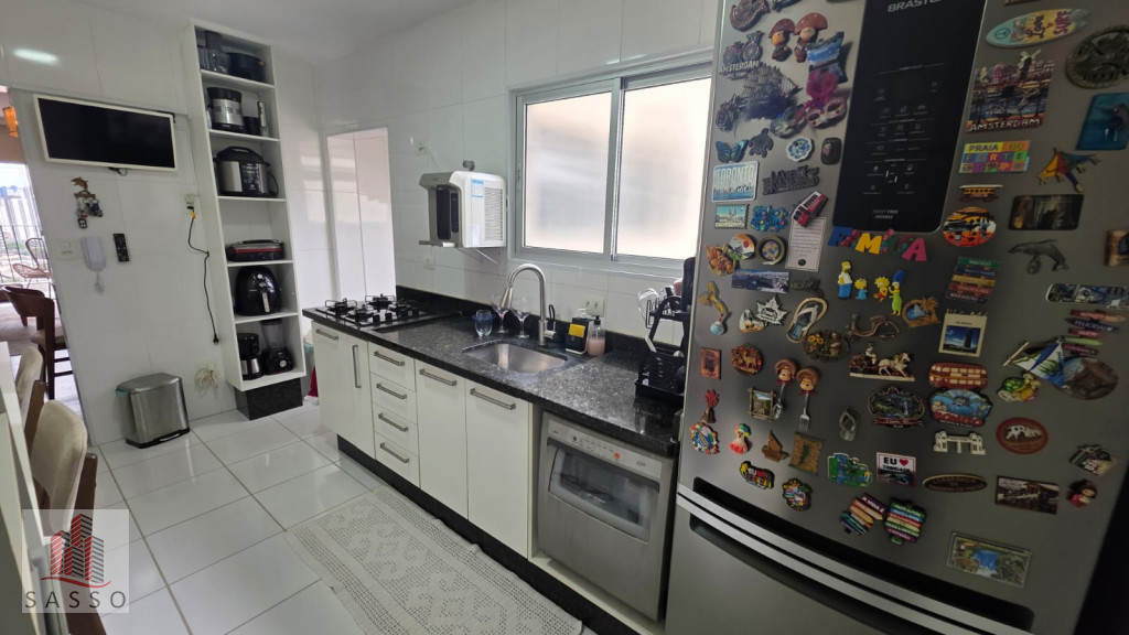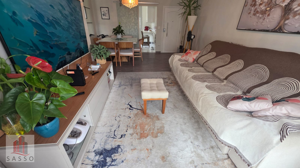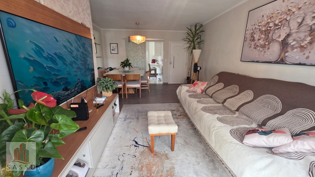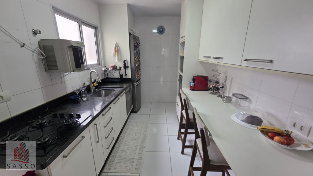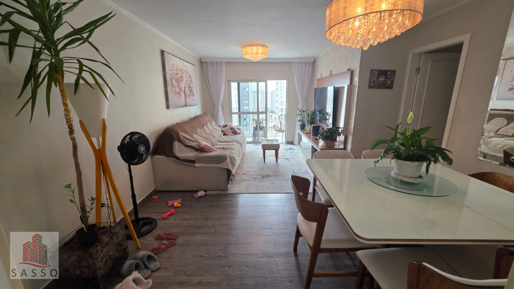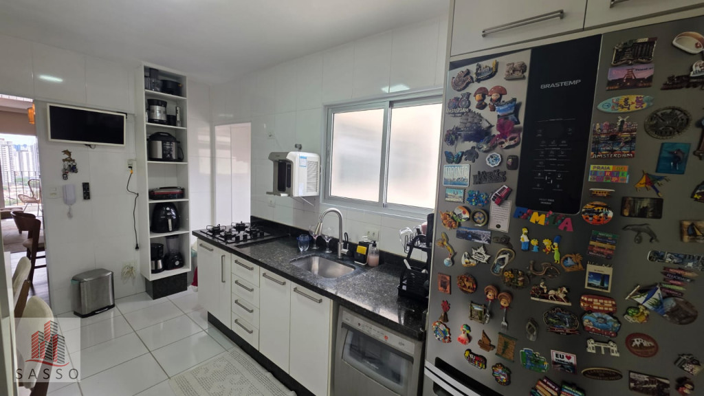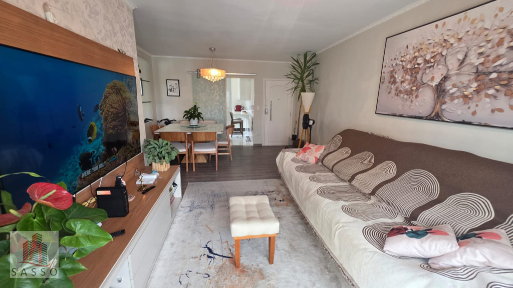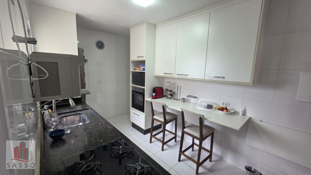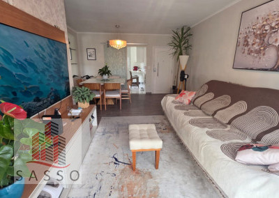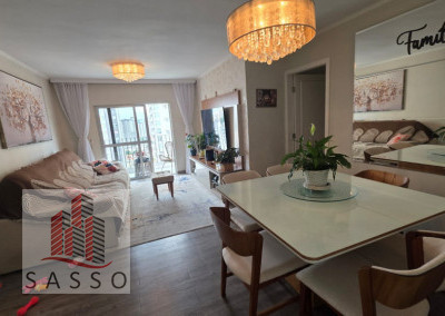 São 97 metros quadrados com 3 quartos sendo 1 suíte, sala com 2 ambientes e varanda, cozinha, 2 banheiros e área de serviço e 2 vagas de garagem.
